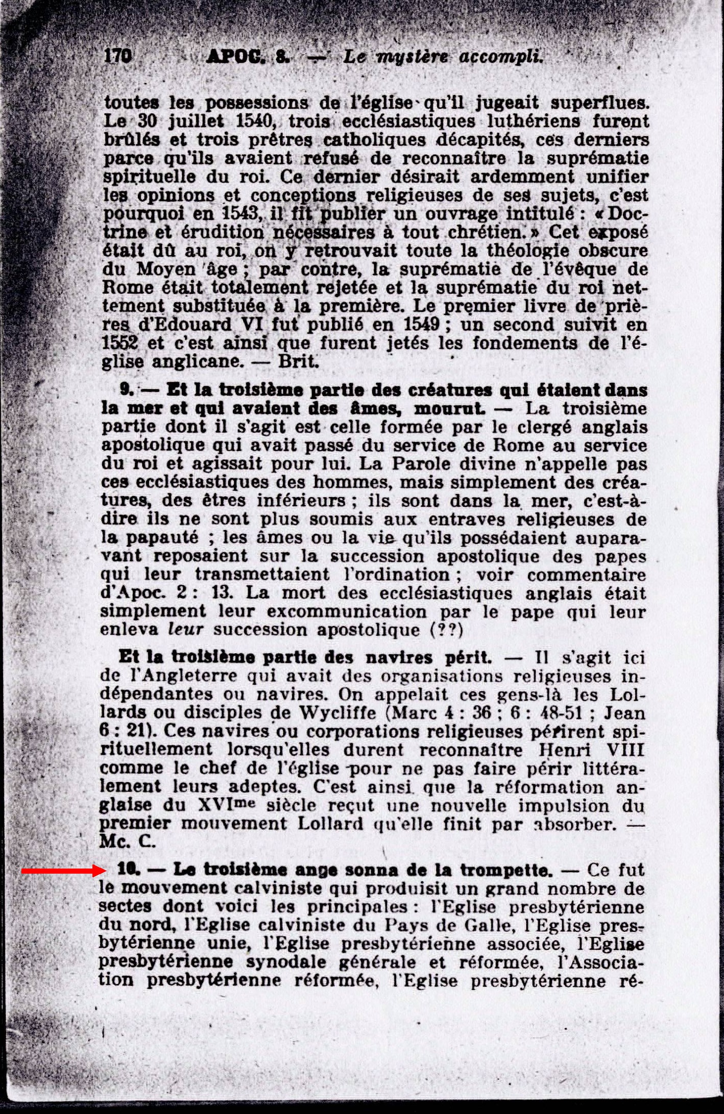 10. - Le troisième ange sonna de la trompette. - Ce fut le mouvement calviniste qui produisit un grand nombre de sectes dont voici les principales : l'Eglise presbytérienne du nord, l'Eglise calviniste du Pays de Galle, l'Eglise presbytérienne unie, l'Eglise presbytérienne associée, l'Eglise presbytérienne réformée, l'Eglise presbytérienne réformée des Etats-Unis et du Canada, l'Eglise réformée de Holande, l'Eglise réformée allemande, l'Eglise réformée chrétienne, l'Eglise réformée hongroise, l'Eglise congrégationaliste, etc. La division continuait, l'esprit d'union et d'harmonie était absent. - 1 Cor. 3:3. Source : 🇫🇷 1917 - Le Mystère Accompli, page 170, page 171 + Cover |