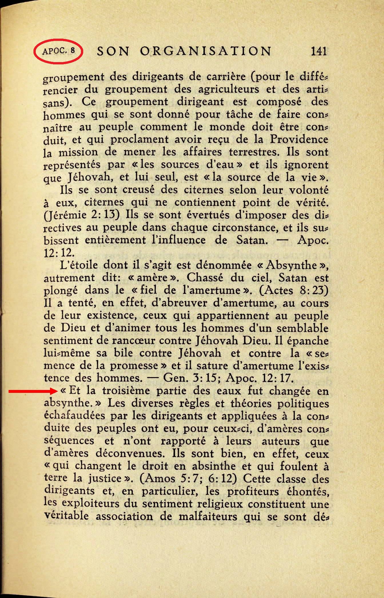«L'étoile» - ou, autrement dit: Satan - «tomba (du ciel) sur le tiers des fleuves et sur les sources des eaux.» Ce verset s'applique, de toute évidence, au groupement des dirigeants de carrière (pour le différencier du groupement des agriculteurs et des artisans). [...] Ils sont représentés par «les sources d'eau» et ils ignorent que Jéhovah, et lui seul, est «la source de la vie». [...] Ils se sont évertués d'imposer des directives au peuple dans chaque circonstance, et ils subissent entièrement l'influence de Satan. - Apoc. 12:12. L'étoile dont il s'agit est dénommée «Absynthe», autrement dit: «amère», Chassé du ciel, Satan est plongé dans le «fiel de l'amertume». (Actes 8:23) Il a tenté, en effet, d'abreuver d'amertume, au cours de leur existence, ceux qui appartiennent au peuple de Dieu et d'animer tous les hommes d'un semblable sentiment de rancoeur contre Jéhovah Dieu. Il épanche lui-même sa bile contre Jéhovah et contre la "semence de la promesse" et il sature d'amertume l'existence des hommes. - Gen. 3:15; Apoc. 12:17. «Et la troisième partie des eaux fut changée en absynthe.» Les diverses règles et théories politiques échafaudées par les dirigeants et appliquées à la conduite des peuples ont eu, pour ceux-ci, d'amères conséquences et n'ont rapporté à leurs auteurs que d'amères déconvenues. Ils sont bien, en effet, ceux "qui changent le droit en absinthe et qui foulent à terre la justice". (Amos 5:7; 6:12) Cette classe des dirigeants et, en particulier, les profiteurs éhontés, les exploiteurs du sentiment religieux constituent une véritable association de malfaiteurs qui se sont détournés de la lumière en possession de laquelle ils se trouvaient. «Le juste qui bronche devant le méchant est comme une fontaine embourbée et une source gâtée.» (Prov. 25 :26) Source : 🇫🇷 1930 - Lumière, vol 1, page 141, page 142, Cover |