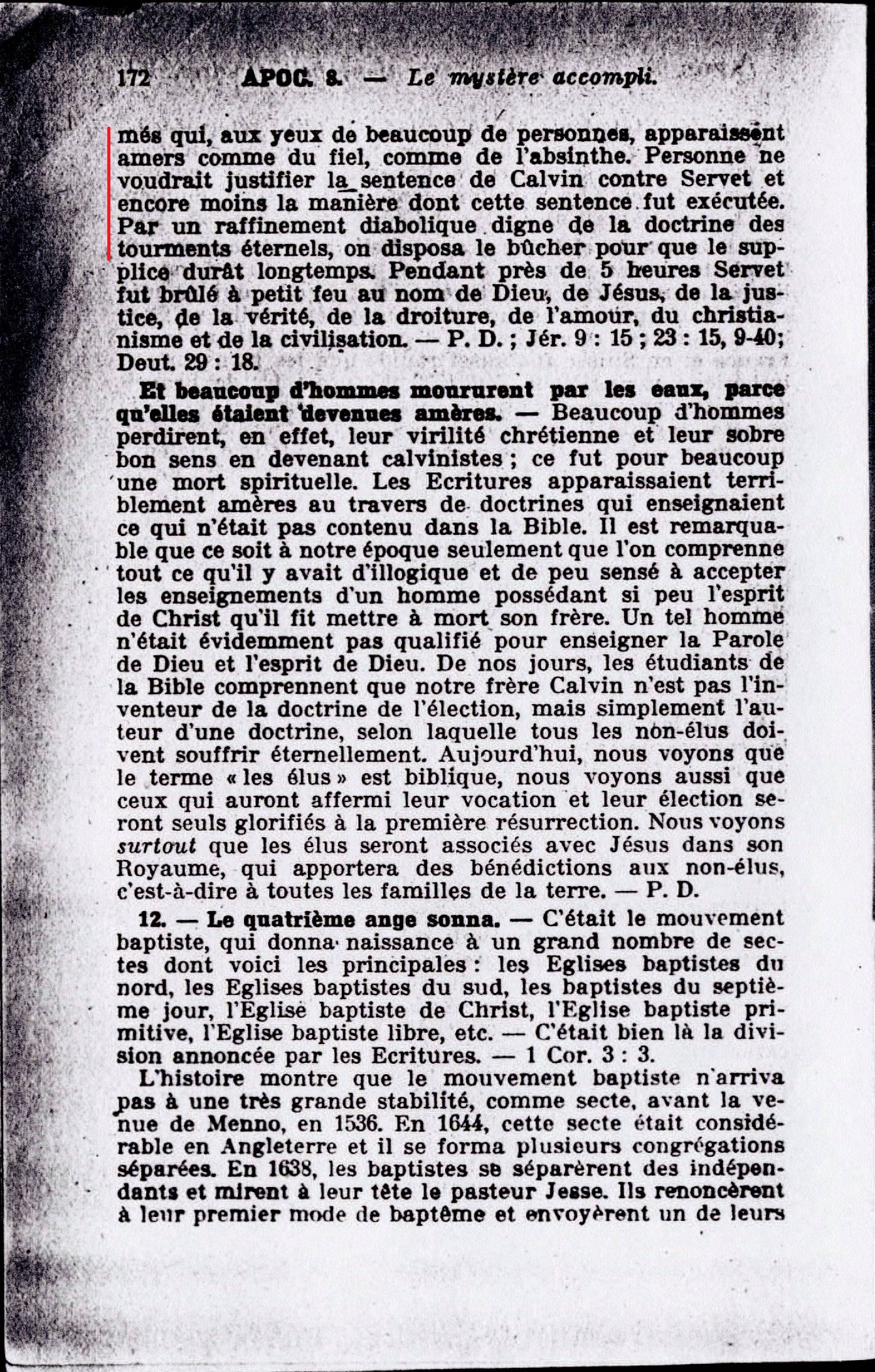 11. - Le nom de cette étoile est Absinthe; [...] Le terme absinthe, désignant Calvin, marque évidemment l'erreur fondamentale enseignée par celui qui fit brûler Servet; il stigmatisa la théorie des tourments éternels. Cette troisième partie des eaux devenant amères est une image des passages scripturaires incompris. Mal appliqués et déformés qui, aux yeux de beaucoup de personnes apparaissent amers comme du fiel, comme de l'absinthe. Personne ne voudrait justifier la sentence de Calvin contre Servet et encore moins la manière dont cette sentence fut exécutée. Par un raffinement diabolique digne de la doctrine des tourments éternels, [...] Source : 🇫🇷 1917 - Le Mystère Accompli, page 171, page 172 + Cover |
