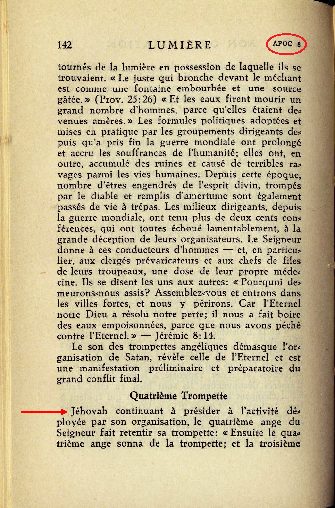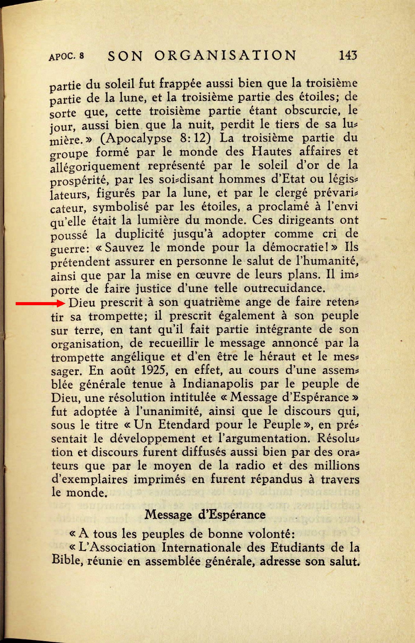 Jéhovah continuant à présider à l'activité déployée par son organisation, le quatrième ange du Seigneur fait retentir sa trompette: [...] Dieu prescrit à son quatrième ange de faire retentir sa trompette; il prescrit également à son peuple sur terre, en tant qu'il fait partie intégrante de son organisation, de recueillir le message annoncé par la trompette angélique et d'en être le héraut et le messager. En août 1925, en effet, au cours d'une assemblée générale tenue à Indianapolis par le peuple de Dieu, une résolution intitulée "Message d'Espérance" fut adoptée à l'unanimité, ainsi que le discours qui, sous le titre "Un Etendard pour le peuple", en présentait le développement et l'argumentation. Résolution et discours furent diffusés aussi bien par des orateurs que par le moyen de la radio et des millions d'exemplaires imprimés en furent répandus à travers le monde. Source : 🇫🇷 1930 - Lumière, vol 1, page 142, page 143, Cover |