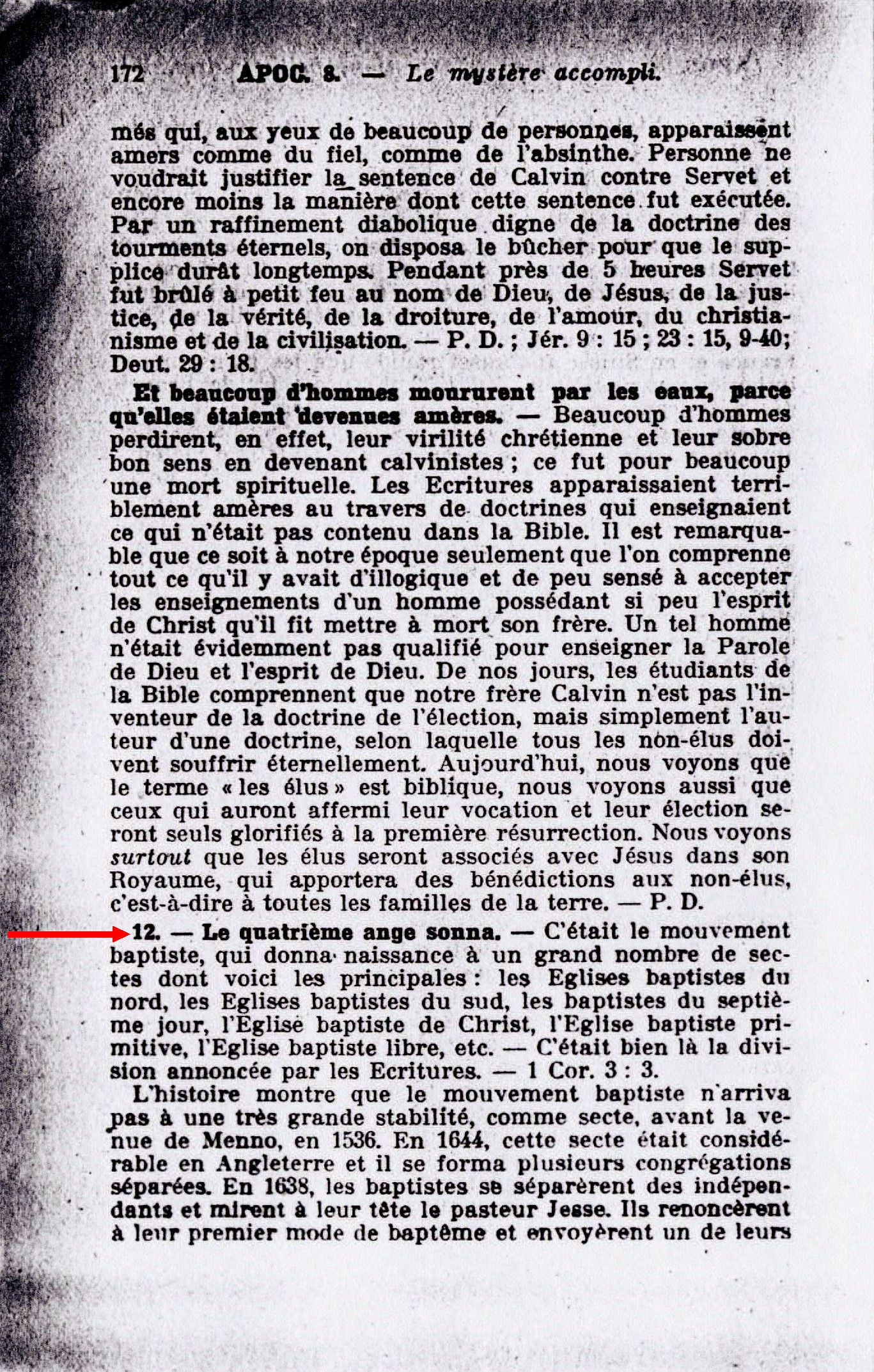 12. - Le quatrième ange sonne. - C'était le mouvement baptiste, qui donna naissance à un grand nombre de sectes dont voici les principales : les Eglises baptistes du nord, les Eglises baptistes du Sud, les baptistes du septième jour, l'Eglises baptiste de Christ, l'Eglises baptiste primitive, l'Eglises baptiste libre, etc. C'était bien là la division annoncée par les Ecritures. - 1 Cor. 3:3. Source : 🇫🇷 1917 - Le Mystère Accompli, page 172 + Cover |