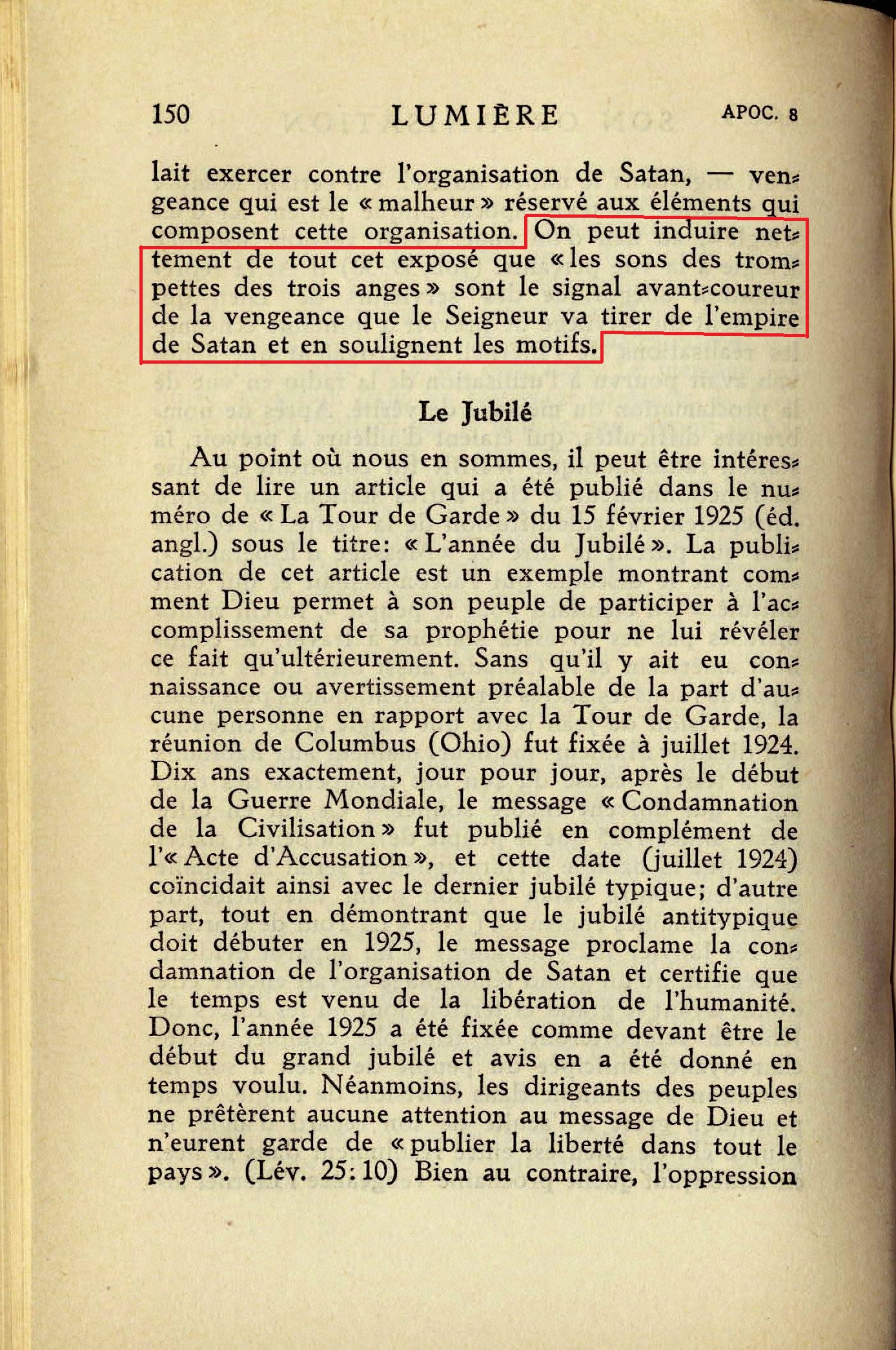 On peut induire nettement de tout cet exposé que "les sons des trompettes des trois anges" sont le signal avant-coureur de la vengeance que le Seigneur va tirer de l'empire de Satan et en soulignent les motifs. Source : 🇫🇷 1930 - Lumière, vol 1, page 150 + Cover |