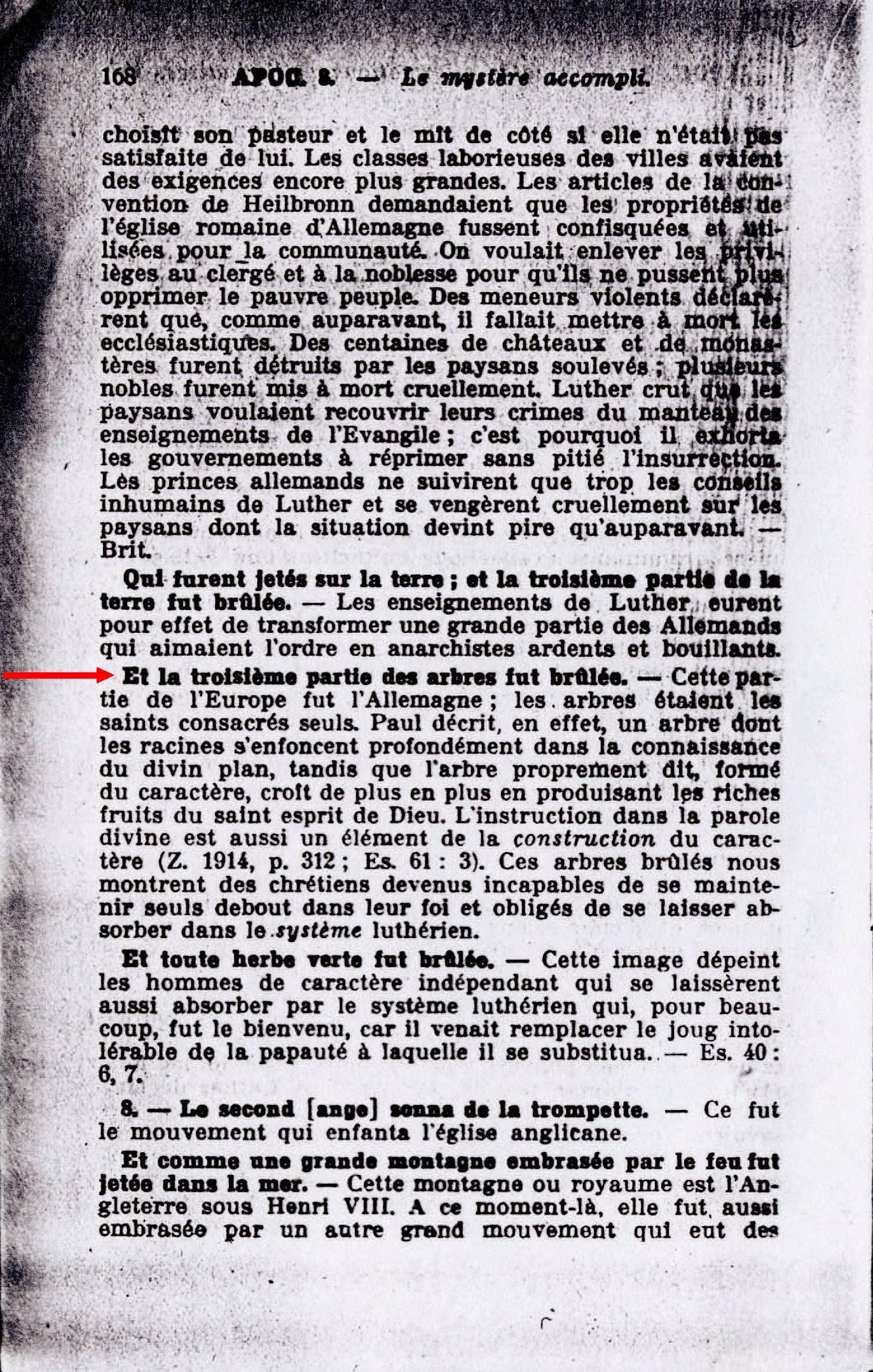 Et la troisième partie des arbres fut brûlée; - cette partie de l'Europe fut l'Allemagne ; les arbres étaient les saints consacrés seuls. Paul décrit, en effet, un arbre dont les racines s'enfoncent profondément dans la connaissance du divin plan, tandis que l'arbre proprement dit, formé du caractère, croît de plus en plus en produisant les riches fruits du saint-esprit de Dieu. L'instruction dans la parole divine est aussi un élément de la construction du caractère [...] Ces arbres brûlés nous montrent des chrétiens devenus incapables de se maintenir seuls debout dans leur foi et obligés de se laisser absorber dans le système luthérien. Source : 🇫🇷 1917 - Le Mystère Accompli, page 168 + Cover |