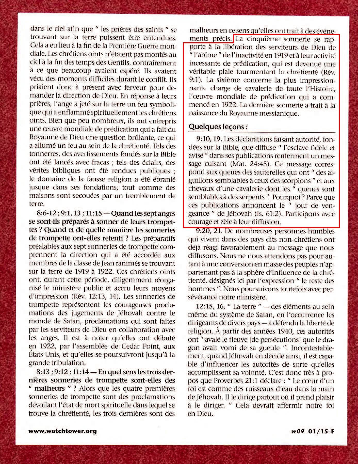 Quelques leçons: 9:10, 19. Les déclarations faisant autorité, fondées sur la Bible, que diffuse "l'esclave fidèle et avisé" dans ses publications renferment un message cuisant (Mat. 24:45). Ce message correspond aux queues des sauterelles qui ont "des aiguillons semblables à ceux des scorpions" et aux chevaux d'une cavalerie dont les "queues sont semblables à des serpents". Pourquoi ? Parce que ces publications annoncent le "jour de vengeance" de Jéhovah (Is. 61:2). Participons avec courage et zèle à leur diffusion. Source : 🇫🇷 La Tour de Garde, 15 Janvier 2009, page 32 + Cover |