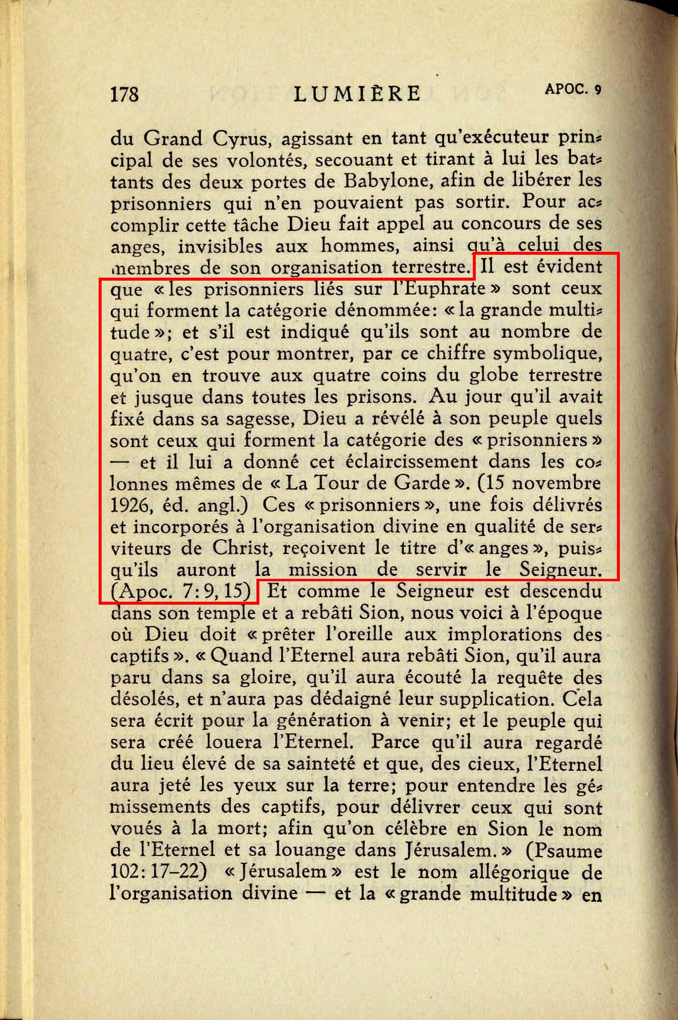 Délie ceux qui sont liés "Et le sixième ange fit retentir sa trompette" et le commandement suivant fut donné: "Délie les quatre anges qui sont liés sur le grand fleuve de l'Euphrate." (Apoc. 9:13-21) En définissant et en recherchant à qui s'appliquent les mots "ceux qui sont liés", nous contribuerons à éclairer le sens de la prophétie [...] Il est évident que "les prisonniers liés sur Euphrate" sont ceux qui forment la catégorie dénommée: "la grande multitude"; et s'il est indiqué qu'ils sont au nombre de quatre, c'est pour montrer, par ce chiffre symbolique, qu'on en trouve aux quatres coins du globe terrestre et jusque dans toutes les prisons. Au jour qu'il avait fixé dans sa sagesse, Dieu a révélé à son peuple quels sont ceux qui forment la catégorie des "prisonniers" - et il lui a donné cet éclaircissement dans les colonnes mêmes de "La Tour de Garde". (15 novembre 1926, éd. angl.) Ces "prisonniers", une fois délivrés et incorporés à l'organisation divine en qualité de serviteurs de Christ, reçoivent le titre d' "anges", puisqu'ils auront la mission de servir le Seigneur (Apoc. 7:9, 15) Source : 🇫🇷 1930 - Lumière, vol 1, page 174, page 178 + Cover |