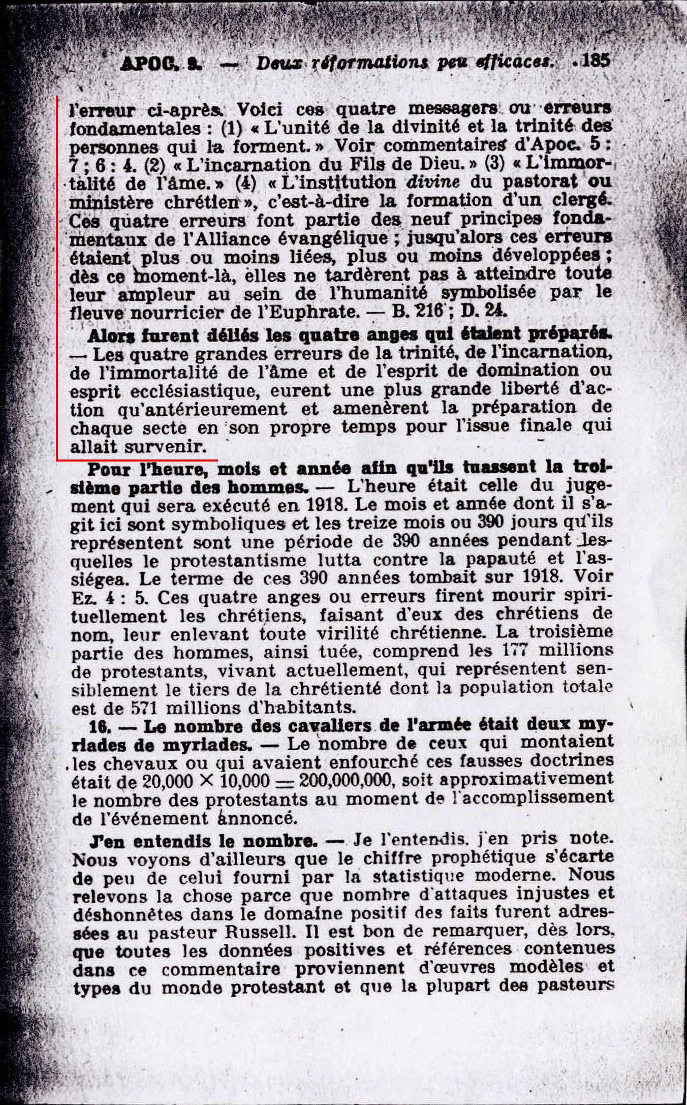 Délie les quatres anges qui sont liés sur le grand fleuve d'Euphrate - Ce fut ainsi que l'Alliance évangélique associée au spiritisme relâcha, propagea les quatres anges de l'erreurs ci-après. Voici ces quatre messager ou erreurs fondamentales : (1) "L'unité de la divinité et la trinité des personnes qui la forment."... (2) "L'incarnation du Fils de Dieu" (3) "L'immortalité de l'âme." (4) "L'institution divine du pastorat ou ministère chrétien", c'est-à-dire la formation d'un clergé. Ces quatres erreurs font partie des neufs principes fondamentaux de ,l'Alliance évangélique; [...] Alors furent déliés les quatre anges qui étaient préparés. - Les quatres grandes erreurs de la trinité, de l'incarnation de l'immortalité de l'âme et de l'esprit de domination ou esprit ecclésiastique, eurent une plus grande liberté d'action qu'antérieurement et amenèrent la préparation de chaque secte en son propre temps pour l'issue finale qui allait survenir. Source : 🇫🇷 1917 - Le Mystère Accompli, page 184, page 185 + Cover |