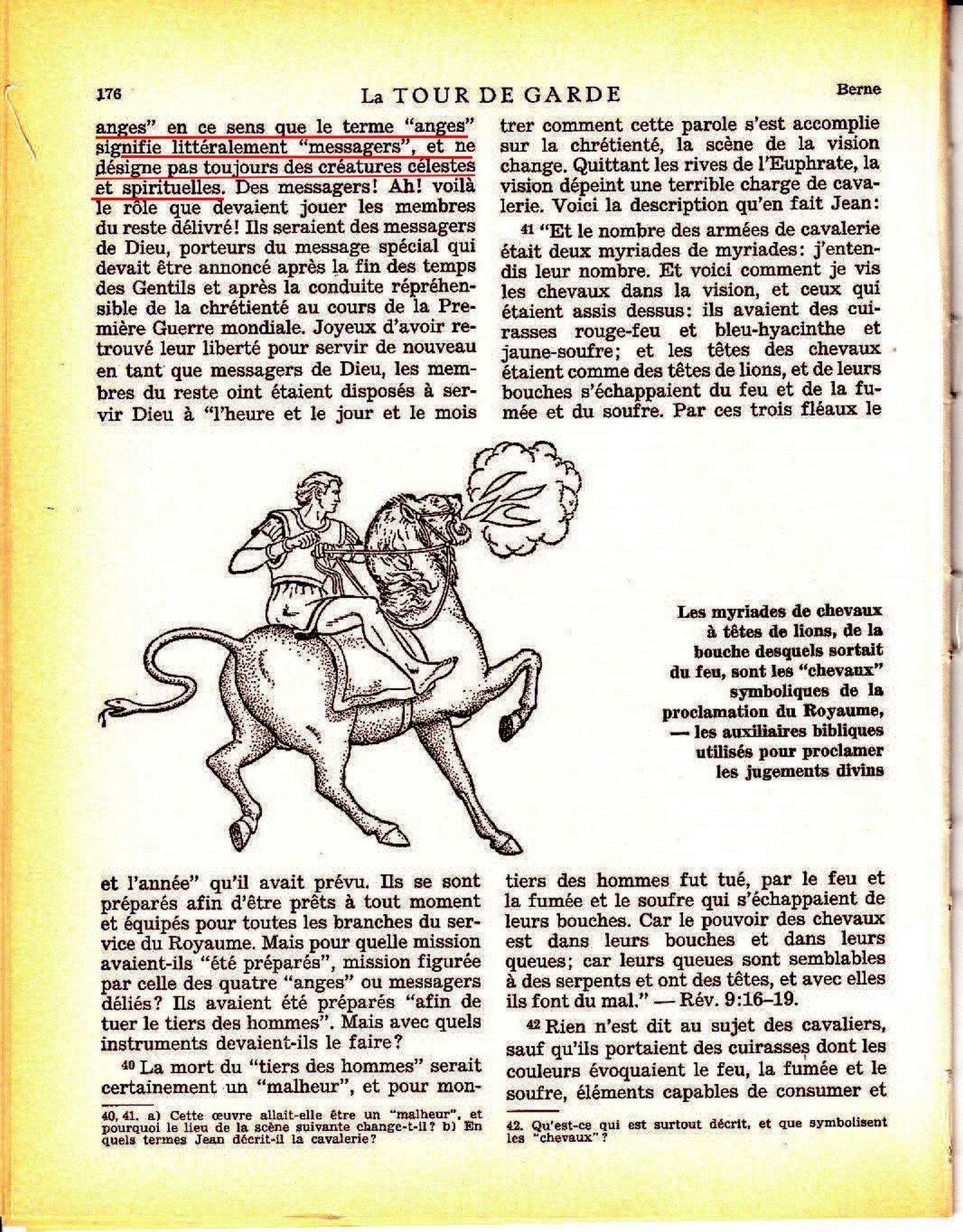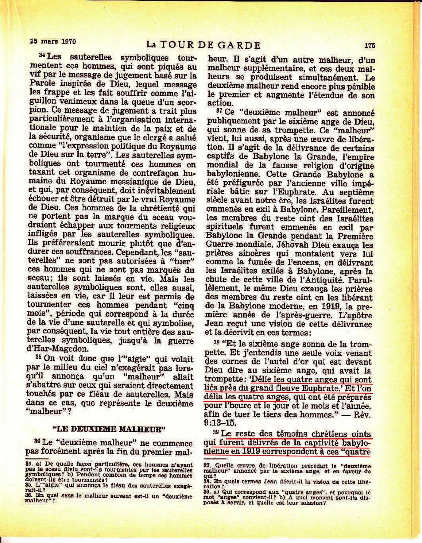Et le sixième ange sonna de la trompette. Et j'entendis une seule voix venant des cornes de l'autel d'or qui est devant Dieu dire au sixième ange, qui avait la trompette: Délie les quatre anges qui sont liés près du grand fleuve Euphrate. Et l'on délia les quatre anges, qui ont été préparés pour l'heure et le jour et le mois et l'année, afin de tuer le tiers des hommes." - Rév.9:13-15 Le reste des témoins chrétiens oints qui furent délivrés de la captivité babylonienne en 1919 correspondent à ces "quatre anges" en ce sens que le terme "anges" signifie littéralement "messagers" et ne désigne pas toujours des créatures célestes et spirituelles. Source : 🇫🇷 La Tour de Garde, 15 Mars 1970 page 175, page 176 + Cover |