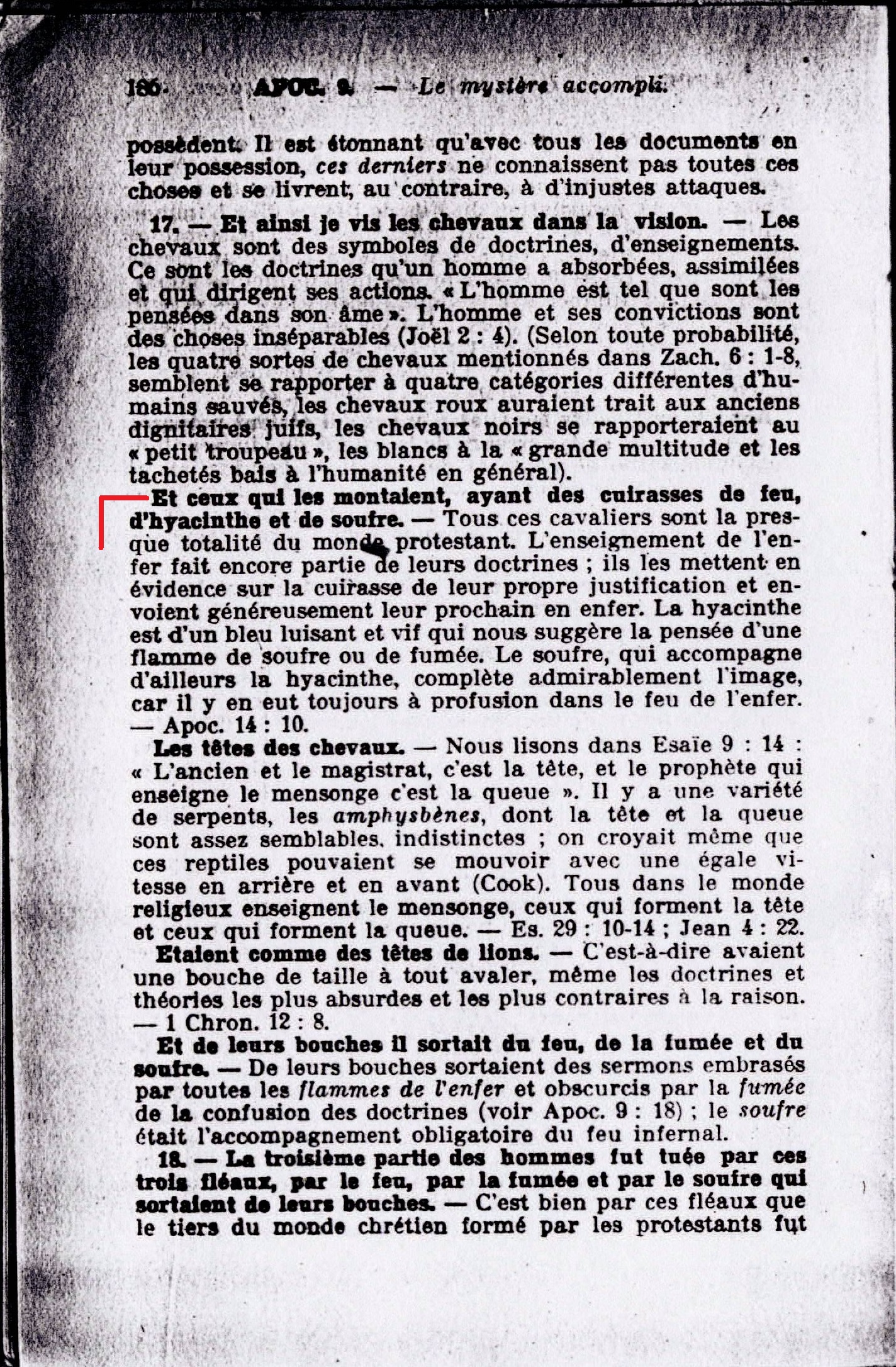 16. - Le nombre des cavaliers de l'armée était deux myriades de myriades. - Le nombre de ceux qui montaient les chevaux ou qui avaient enfourché ces fausses doctrines était de 20 000 X 10 000 = 200 000 000, soit appoximativement le nombre des protestants au moment de l'accomplissement de l'événement annoncé. Et ceux qui les montaient, ayant des cuirasses de feu, d'hyacinthe et de soufre. - Tous ces cavaliers sont la presque totalité du monde protestant. Source : 🇫🇷 1917 - Le Mystère Accompli, page 185, page 186 + Cover |