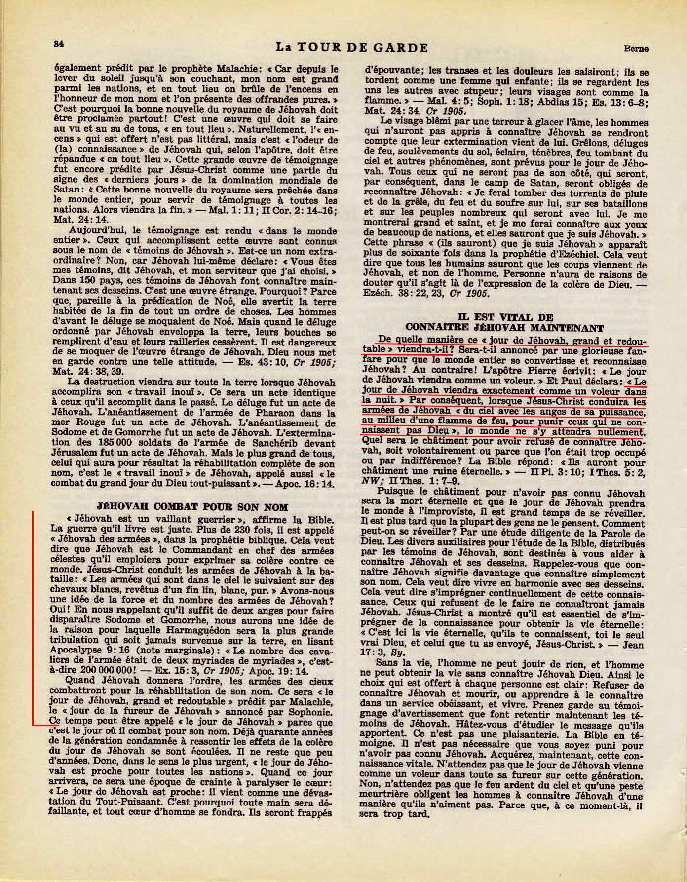 "Jéhovah est un vaillant guerrier", affirme la Bible [...] Jéhovah est le Commandant en chef des armées célestes qu'il emploiera pour exprimer sa colère contre ce monde. Jésus-Christ conduit les armées de Jéhovah à la bataille : "Les armées qui sont dans le ciel le suivaient sur des chevaux blancs, revêtus d'un fil lin, blanc, pur." Avons-nous une idée de la force et du nombre des armées de Jéhovah ? Oui ! En nous rappelant qu'il suffit de deux anges pour faire disparaître Sodome et Gommorhe, nous aurons une idée de la raison pour laquelle Harmaguédon sera la plus grande tribulation qui soit jamais survenue sur la terre, en lisant Apocalypse 9:16 (note marginale): "Le nombre des cavaliers de l'armée était de deux myriades de myriades", c'est-à-dire 200 000 000 ! Quand Jéhovah donnera l'ordre, les armées des cieux combattront pour la réhabilitation de son nom. Ce sera "le jour de Jéhovah, grand et redoutable" prédit par Malachie, le "jour de la fureur de Jéhovah" annoncé par Sophonie. Ce temps peut être appelé "le jour de Jéhovah" [...] IL EST VITAL DE CONNAITRE JEHOVAH MAINTENANT De quelle manière ce "jour de Jéhovah, grand et redoutable" viendra-t-il [...] Le jour de Jéhovah viendra exactement comme un voleur dans la nuit. Par conséquent Jésus-Christ conduira les armées de Jéhovah " du ciel avec les anges de sa puissance, au milieu d'une flamme de feu, pour punir ceux qui ne connaissent pas Dieu", le monde ne s'y attendra nullement Source : 🇫🇷 La Tour de Garde, 15 Mars 1955, page 84 + Cover |