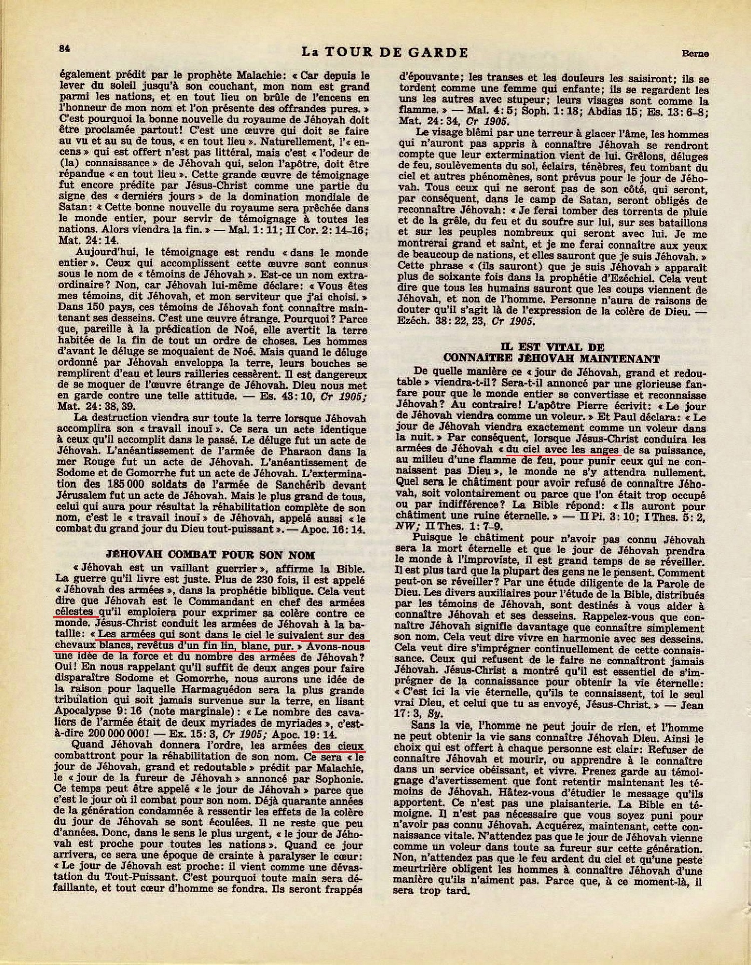Jéhovah est le Commandant en chef des armées célestes qu'il emploiera pour exprimer sa colère contre ce monde. Jésus-Christ conduit les armées de Jéhovah à la bataille : "Les armées qui sont dans le ciel le suivaient sur des chevaux blancs, revêtus d'un fil lin, blanc, pur." Avons-nous une idée de la force et du nombre des armées de Jéhovah ? Oui ! En nous rappelant qu'il suffit de deux anges pour faire disparaître Sodome et Gommorhe, nous aurons une idée de la raison pour laquelle Harmaguédon sera la plus grande tribulation qui soit jamais survenue sur la terre, en lisant Apocalypse 9:16 (note marginale): "Le nombre des cavaliers de l'armée était de deux myriades de myriades", c'est-à-dire 200 000 000 ! Quand Jéhovah donnera l'ordre, les armées des cieux combattront pour la réhabilitation de son nom. [...] Jésus-Christ conduira les armées de Jéhovah " du ciel avec les anges de sa puissance, au milieu d'une flamme de feu, pour punir ceux qui ne connaissent pas Dieu", le monde ne s'y attendra nullement Source : 🇫🇷 La Tour de Garde, 15 Mars 1955, page 84 + Cover |
