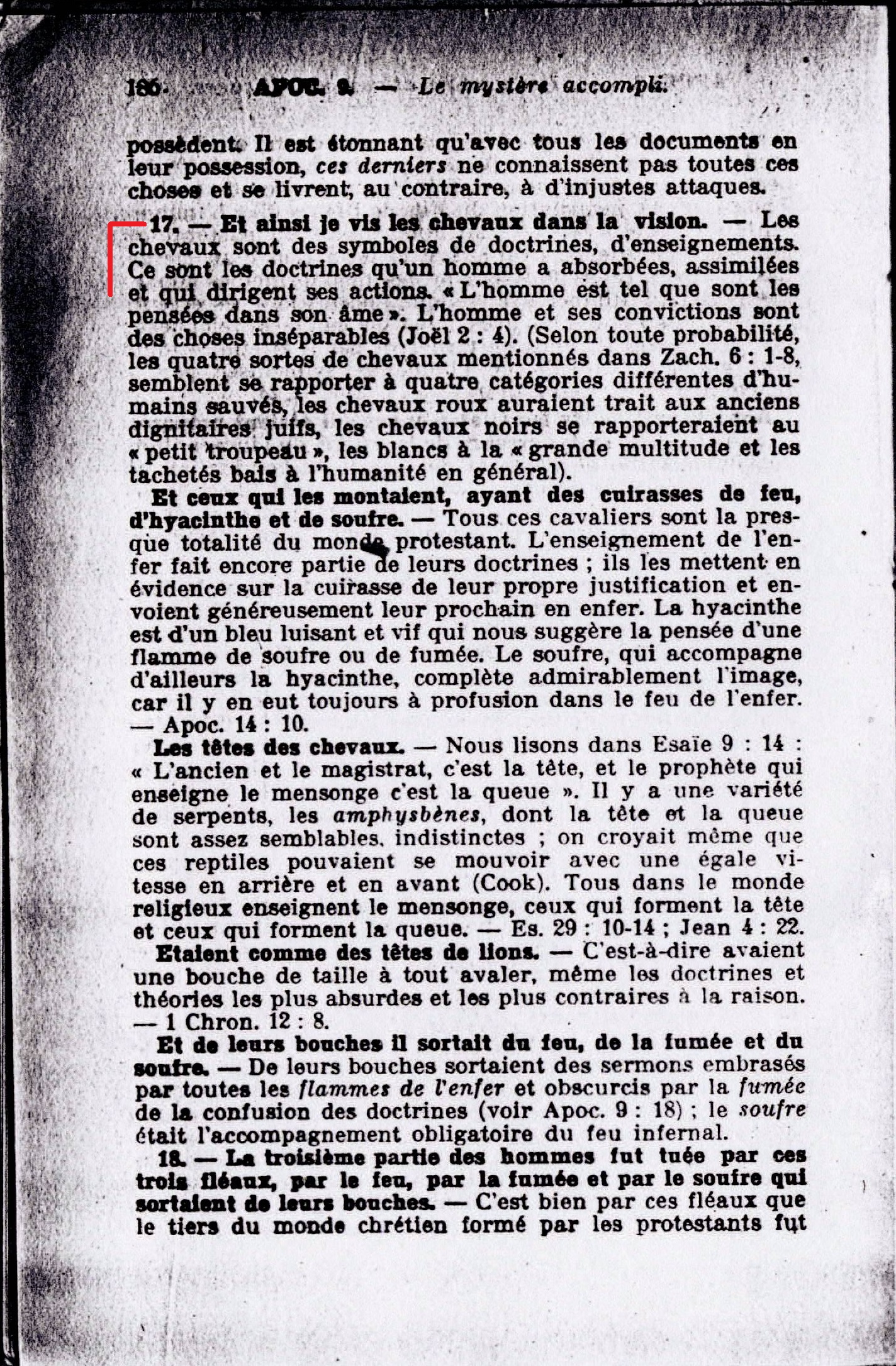 16. - Le nombre des cavaliers de l'armée était deux myriades de myriades. - Le nombre de ceux qui montaient les chevaux ou qui avaient enfourché ces fausses doctrines était de 20 000 X 10 000 = 200 000 000, soit appoximativement le nombre des protestants au moment de l'accomplissement de l'événement annoncé. 17. - Et ainsi je vis les chevaux dans la vision. - Les chevaux sont des symboles de doctrines, d'enseignements. Ce sont les doctrines qu'un homme a absorbées, assimilées et qui dirigent ses actions. Source : 🇫🇷 1917 - Le Mystère Accompli, page 185, page 186 + Cover |