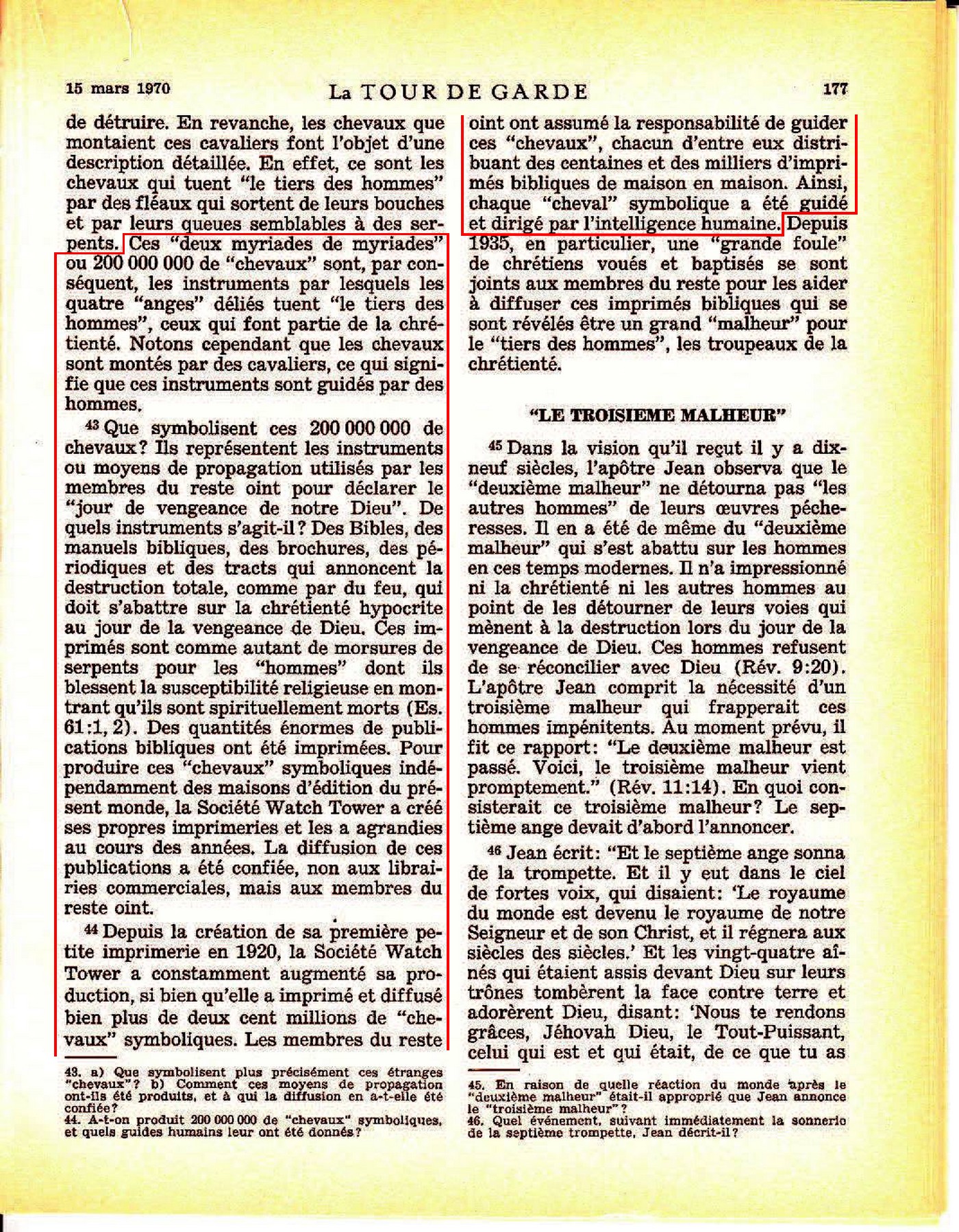 Ces "deux myriades" ou 200 000 000 de "chevaux" sont par conséquent, les instruments par lesquels les quatre "ange" déliés tuent "le tiers des hommes", ceux qui font partie de la chrétienté [...] Que symbolisent ces 200 000 000 chevaux ? Ils représentent les instruments ou moyens de propagation utilisés par les membres du reste oint [...] De quels instruments s'agit-il ? Des Bibles, des manuels bibliques, des brochures, des périodiques et des tracts qui annoncent la destruction totale, comme par du feu, qui doit s'abattre sur la chrétienté hypocrite au jour de la vengeance de Dieu. Ces imprimés sont comme autant de morsures de serpents pour les "hommes" [...] Des quantités énormes de publications ont été imprimées. Pour produire ces "chevaux" symboliques indépendamment des maisons d'édition du présent monde, la Société Watch Tower a crée ses propres imprimeries et les a agrandies au cours des années. La diffusion de ces publications a été confiée, non aux librairies commerciales, mais aux membres du reste oint.