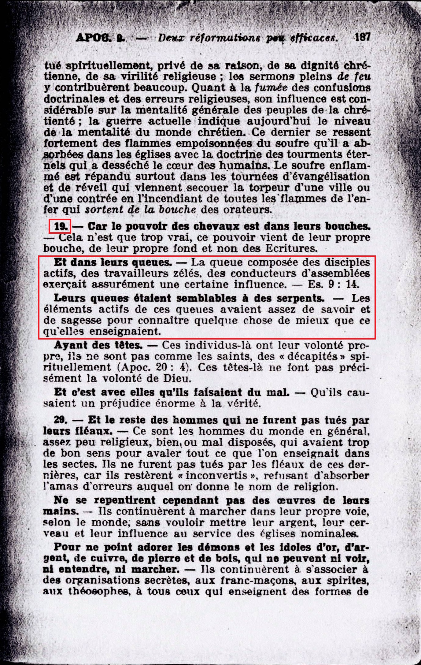 19. - Car le pouvoir des chevaux est dans leurs bouches. [...] Et dans leurs queues. - La queue composée des disciples actifs, des travailleurs zélés, des conducteurs d'assemblées exerçait assurément une certaines influence. - Es. 9:14. Leurs queues étaient semblables à des serpents. - Les éléments actifs de ces queues avaient assez de savoir et de sagesse pour connaître quelque chose de mieux que ce qu'elles enseignaient. Source : 🇫🇷 1917 - Le Mystère Accompli, page 187 + Cover |