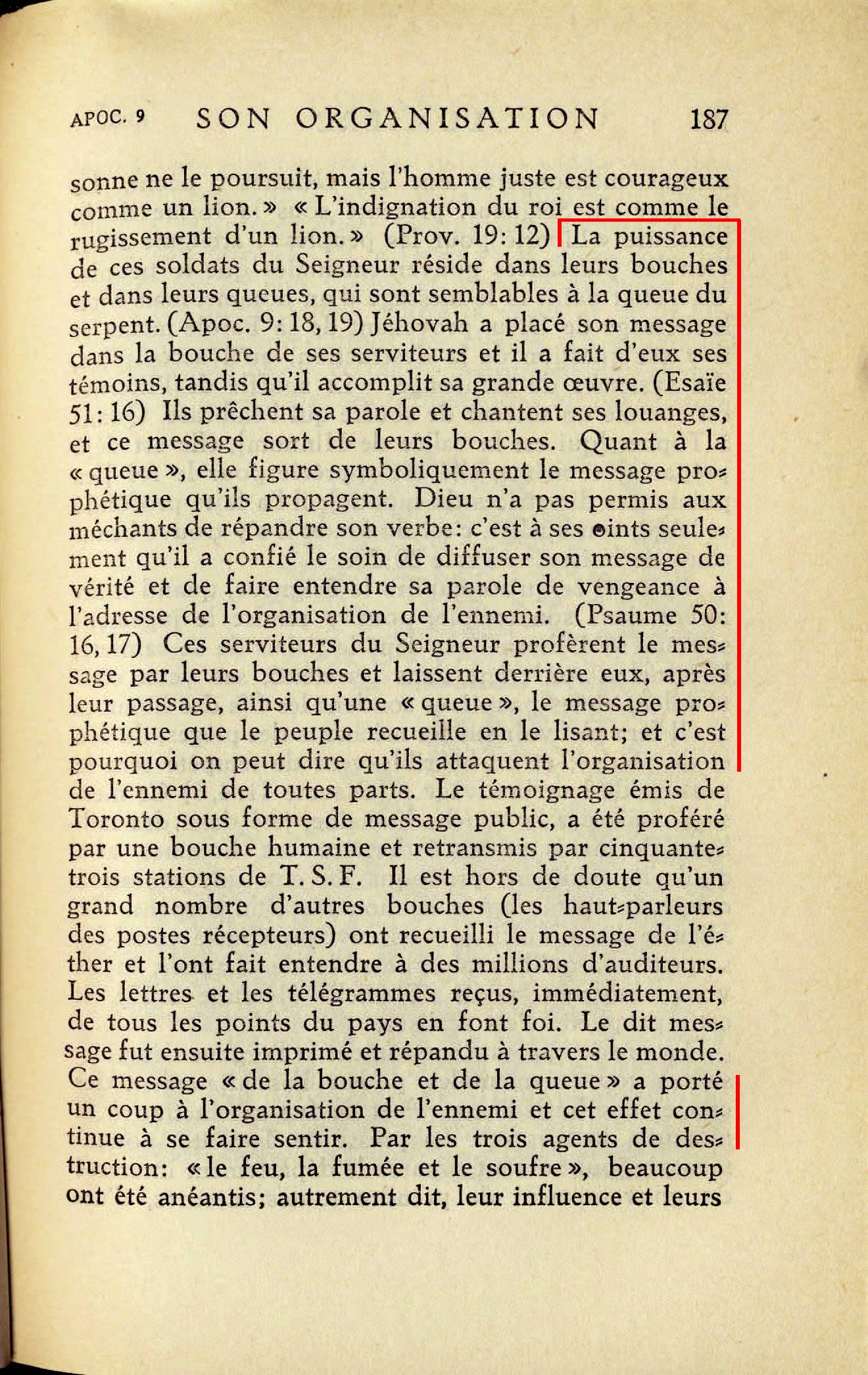 La puissance de ces soldats du Seigneur réside dans leurs bouches et dans leurs queues, qui sont semblables à la queue du serpent. (Apoc. 9:18, 19) Jéhovah a placé son message dans la bouche de ses serviteurs [...], et ce message sort de leurs bouches. Quant à la "queue", elle figure symboliquement le message prophétique qu'ils propagent. Dieu n'a pas permis aux méchants de répandre son verbe: c'est à ses oints seulement qu'il a confié le soin de diffuser son message [...] Ces serviteurs du Seigneur profèrent le message par leurs bouches et laissent derrière eux, après leur passage, ainsi qu' que le peuple recueille en le lisant; et c'est pourquoi on peut dire qu'ils attaquent l'organisation de l'ennemi de toutes parts. [...] Ce message "de la bouche et de la queue" a porté un coup à l'organisation de l'ennemi et cet effet continue à se faire sentir. Source : 🇫🇷 1930 - Lumière, vol 1, page 187 + Cover |