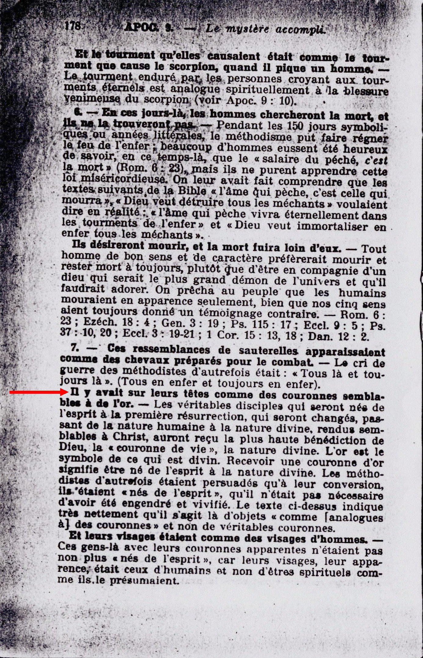 Il y avait sur leurs têtes comme des couronnes semblables à de l'or. - Les véritables disciples qui seront nés de l'esprit à la première résurrection, qui seront changé, passant de la nature humaine à la nature divine, rendus semblables à Christ, auront reçu le plus haute bénédiction de Dieu, la "couronne de vie", la nature divine. L'or est le symbole de ce qui est divin. Recevoir une couronne d'or signifie être né de l'esprit à la nature divine. Les méthodistes d'autrefois étaient persuadés qu'à leur conversion, ils étaient "nés de l'esprit", qu'il n'était pas nécessaire d'avoir été engendré et vivifié. Le texte ci-dessus indique très nettement qu'il s'agit là d'objets "comme [analogues à] des couronnes" et non de véritables couronnes. Et leurs visages étaient comme des visages d'hommes. - Ces gens-là avec leurs couronnes apparentes n'étaient pas non plus "nés de l'esprit", car leurs visages, leur apparence, étaient ceux d'humains et non d'êtres spirituels comme ils le présumaient. Source : 🇫🇷 1917 - Le Mystère Accompli, page 178 + Cover |