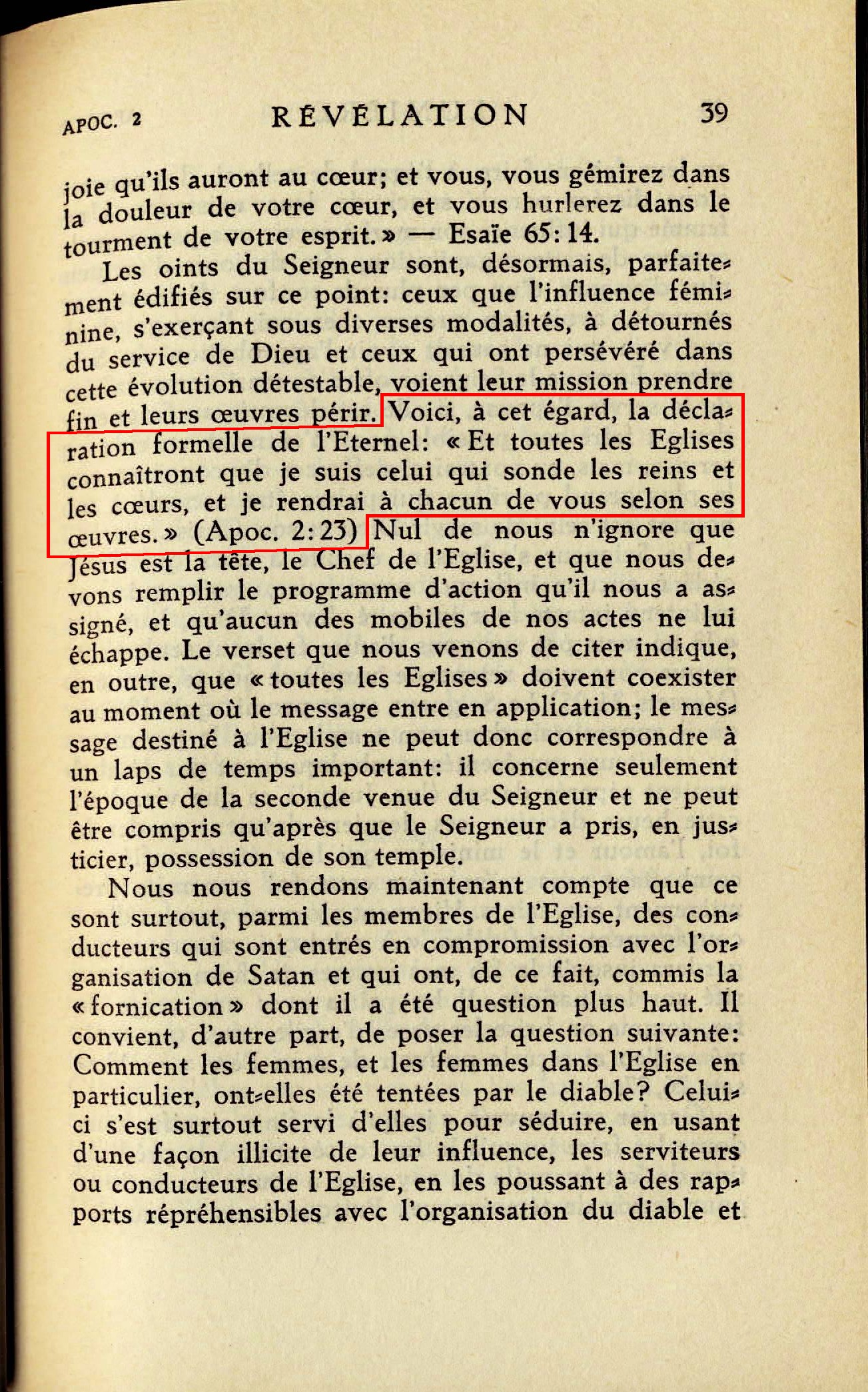 Voici, à cet égard, la déclaration formelle de l'Eternel: "Et toutes les Eglises connaîtront que je suis celui qui sonde les reins et les coeurs, je rendrais à chacun de vous selon ses oeuvres" (Apoc. 2:23)