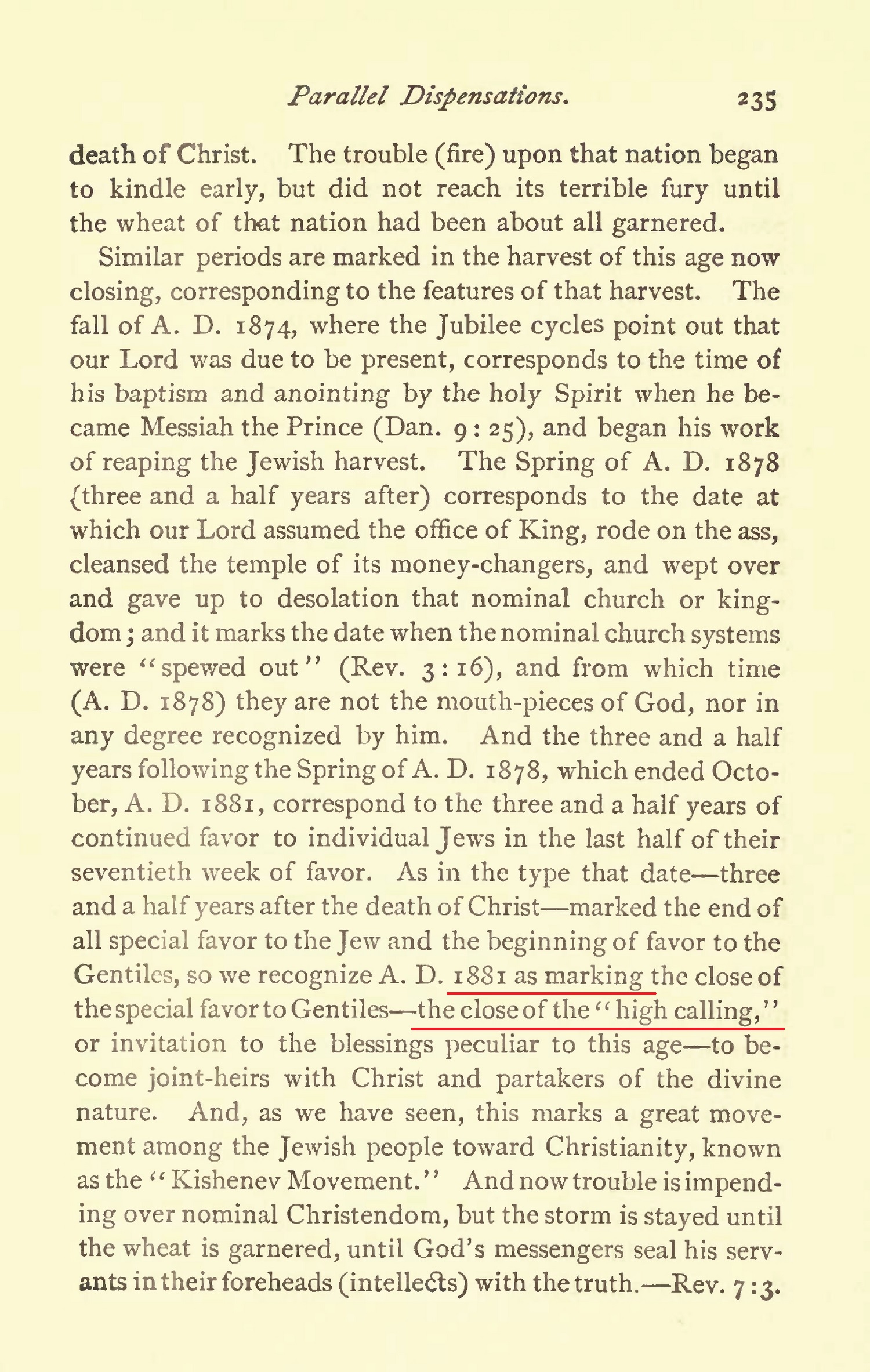 As in the type that date three and a half years after the death of Christ marked the end of all special favor to the Jew and the beginning of favor to the Gentiles, so we recognize A. D. 1881 as marking the close of the special favor to Gentiles the close of the high calling, or invitation to the blessings peculiar to this age to be come joint-heirs with Christ and partakers of the divine