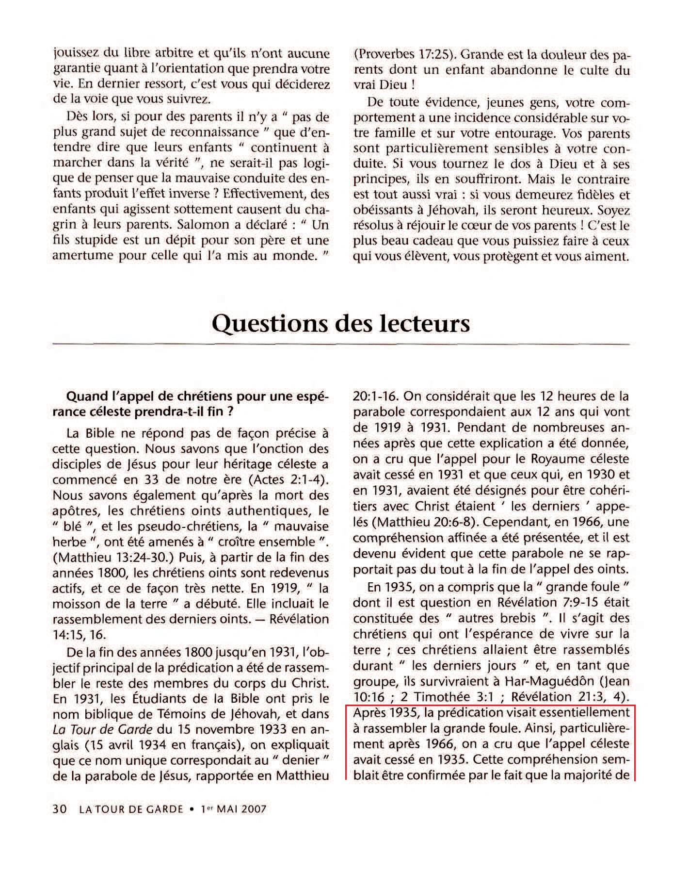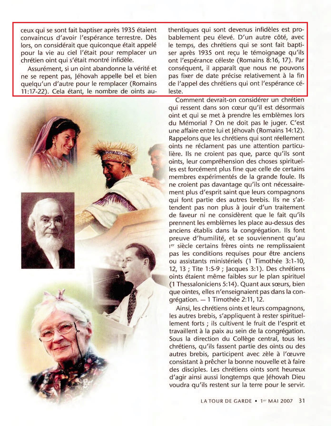 Without a doubt, if one of the anointed unrepentantly falls away, Jehovah does call another individual to take his place. (Romans 11:17-22) However, the number of genuine anointed ones who have become unfaithful is likely not large. On the other hand, as time has gone by, some Christians baptized after 1935 have had witness borne to them that they have the heavenly hope. (Romans 8:16, 17) Thus, it appears that we cannot set a specific date for when the calling of Christians to the heavenly hope ends. Source : 🇺🇸 La Tour de Garde, 1er mai 2007, page 30 et page 31 + Cover |