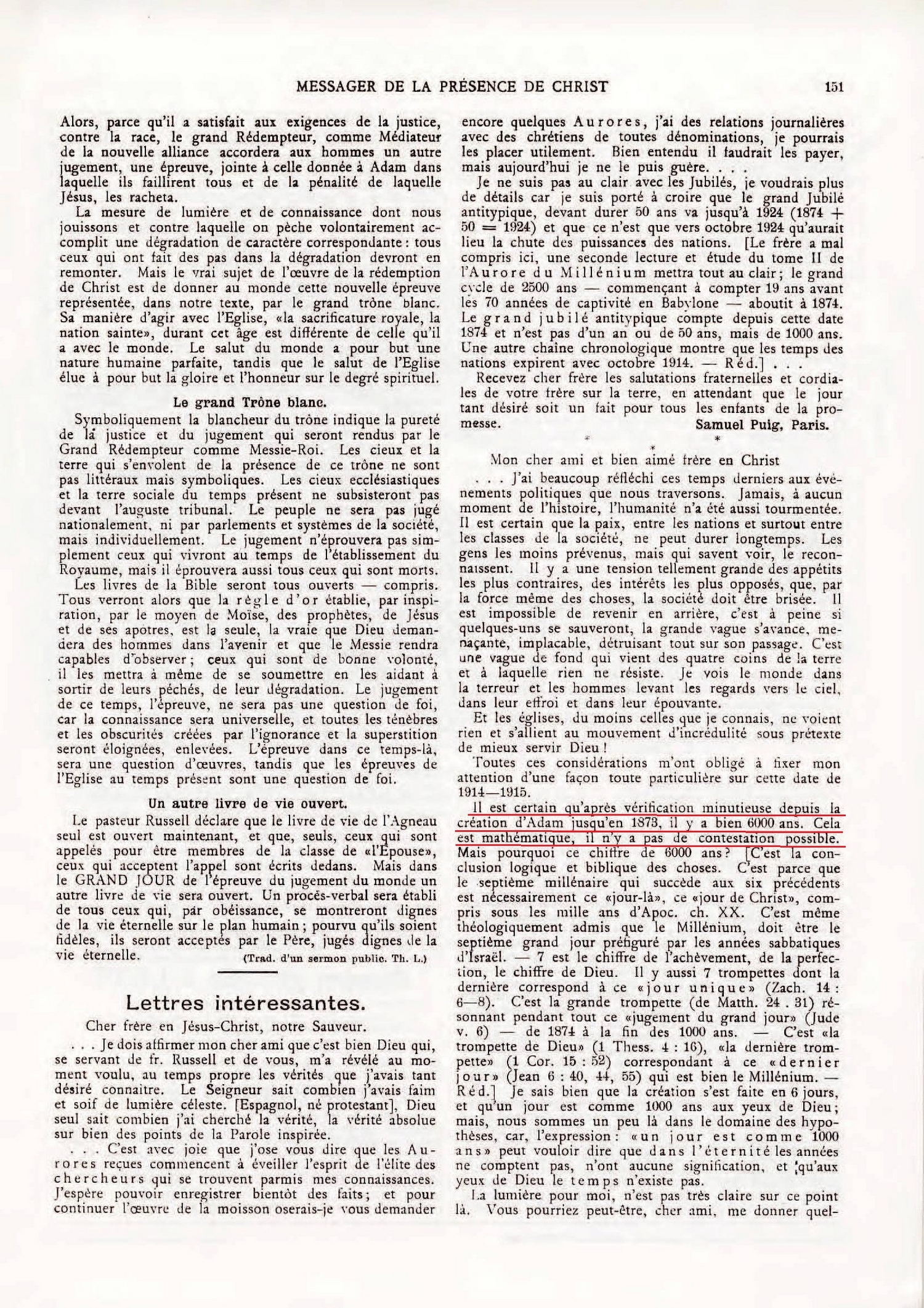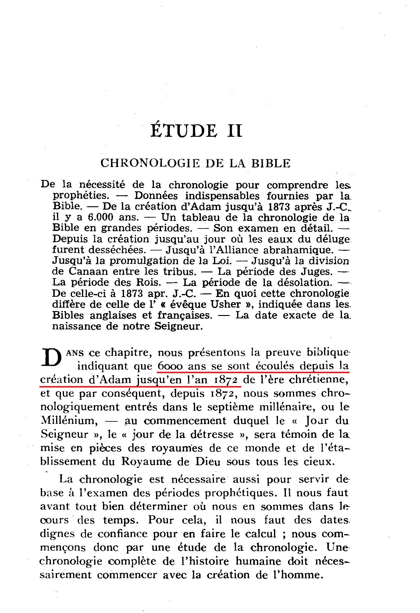 Il est hors de doute que le même Tout-Sage qui nous enseigna par la chronologie que six mille ans depuis la création d'Adam finirent en 1872 et que le septième millier d'années, l'âge millénaire, commença alors,