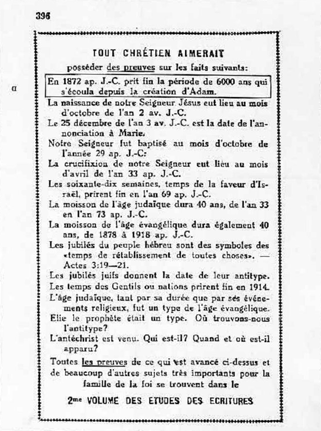 Sous peu, prendront fin les six millénaires de cette domination inique exercée par Satan sur les hommes devenus ses esclaves... La fin de ces six millénaires d'esclavage pénible sous la domination de satan le Diable, ne serait-elle pas pour Jéhovah le moment approprié pour instaurer le millénaire sabbatique en faveur de toutes les créatures humaines ? Certainement!" Et son roi Jésus-Christ sera le Seigneur de ce Sabbat