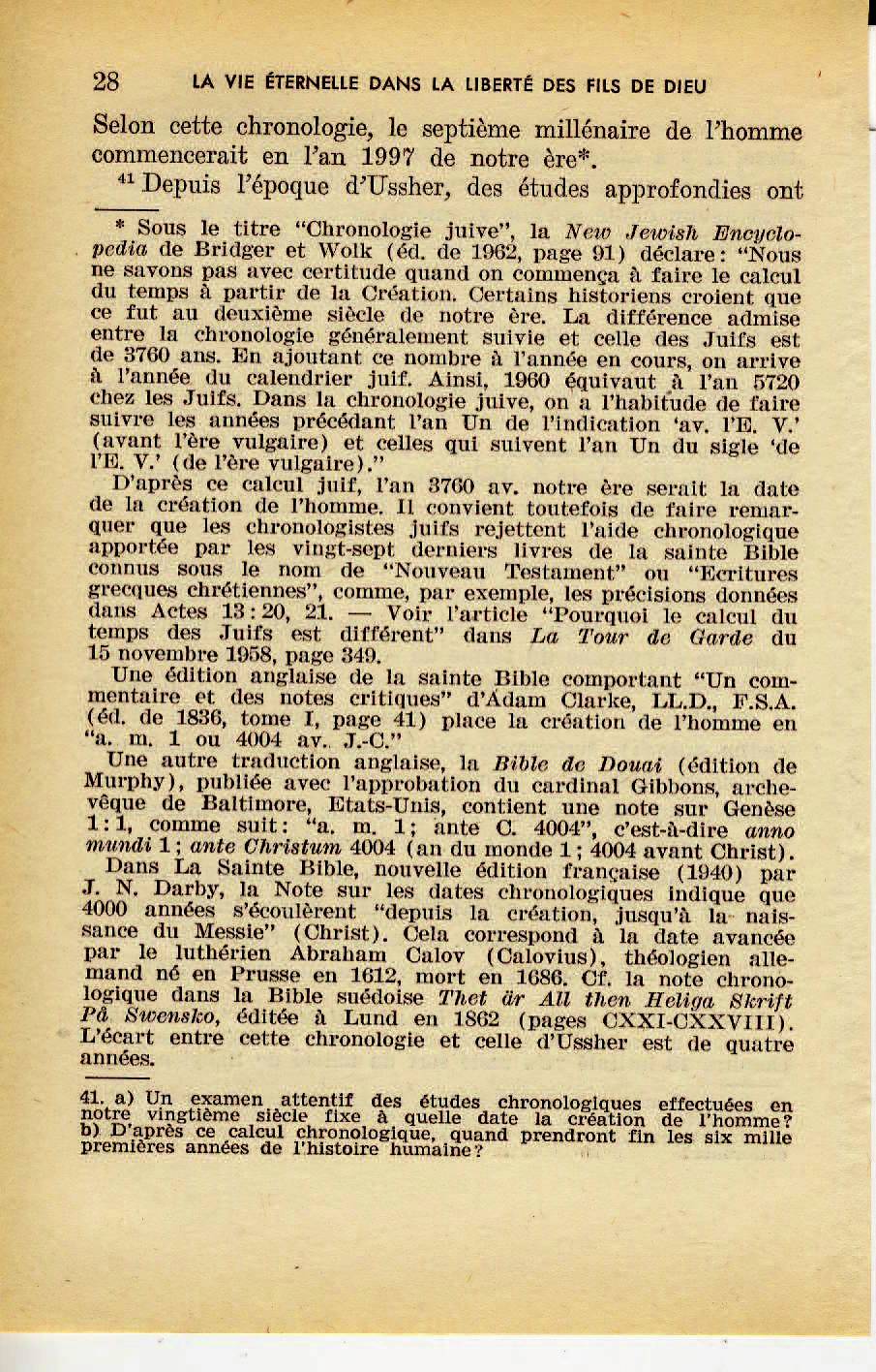 Or, cette chronologie indépendante, déjà publiée, situe la création de l'homme en 4026 av. notre ère. D'après cette chronologie biblique digne de foi, en 1975 six mille années se seront écoulées depuis la création de l'homme, et le septième milléniare de l'histoire humaine commencera en automne 1975...Dans quelques années donc, au cours de notre génération, nous arriverons à ce que Jéhovah Dieu pourrait considérer comme le septième jour de l'existence de l'homme...Combien il serait opportun si Jéhovah Dieu faisait du septième millénaire qui va bientôt commencer un sabbat de repos et de remise, un grand sabbat jubilaire, où la liberté serait proclamée par toute la terre et parmi tous ses habitant! ... Ce ne serait pas par hasard ou fortuitement, mais ce serait en accord avec le dessein bienveillant de Jéhovah Dieu, si le règne de Jésus-Christ, le "Seigneur du sabbat" devait avoir lieu parallèlement au septième millénaire de l'existence humaine.. Le jour béni de son inauguration est maintenant très proche. Sous peu, dans notre génération, la trompette symbolique sonnera par la puissance divine, annonçant "la liberté dans le pays pour tous ses habitants.