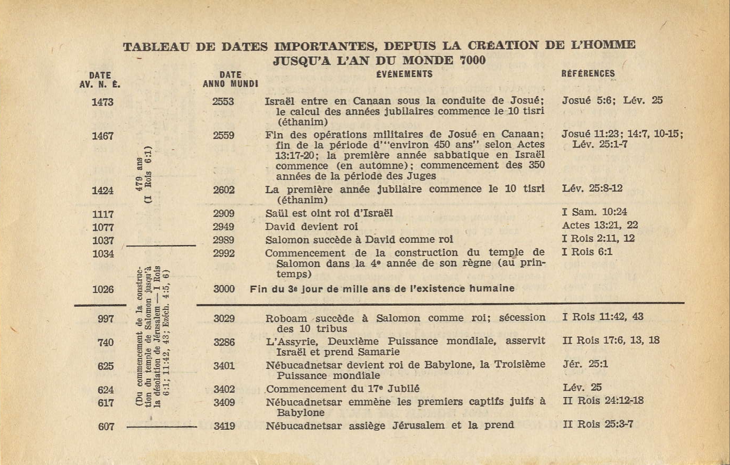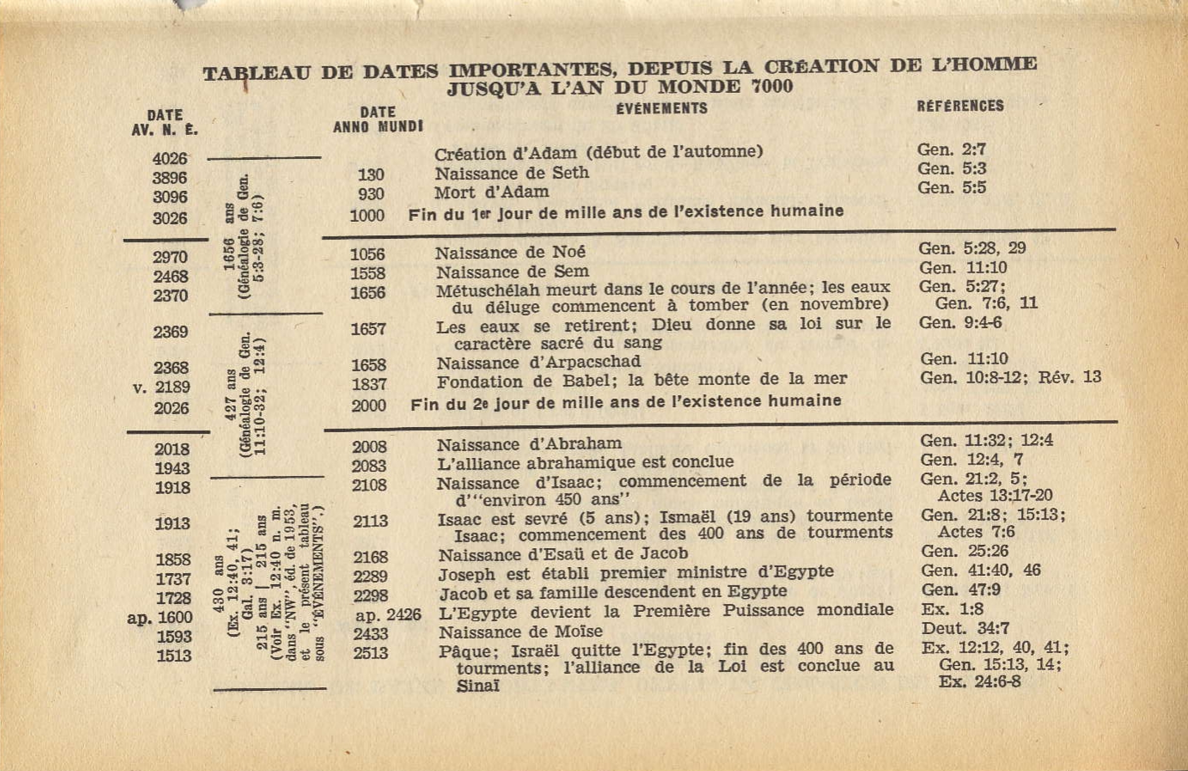 Nous avons donc ainsi établi une ligne de chronologie claire et continue allant de la création à l’ère chrétienne, formant en tout une période de quatre mille cent vingt-huit (4128) ans. En ajoutant ceux-ci aux 1872 ans de l’ère chrétienne, nous obtenons une période de 6ooo ans, allant de la création à l’an 1873 ap. J.-C.