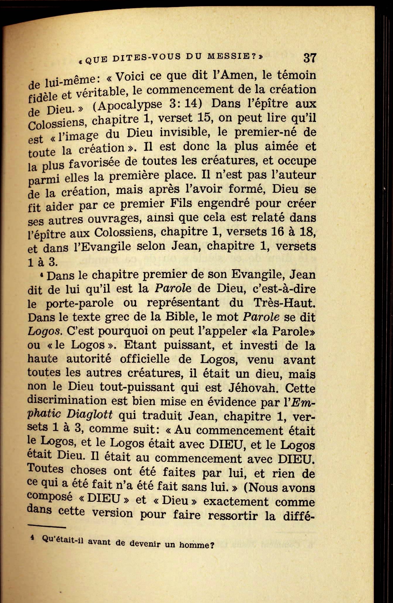 Cette créature supérieure n'était pas Jéhovah Dieu, mais "existait en forme de Dieu". Comment cela ? - Ce personnage était spirituel, esprit comme Dieu, très puissant, mais non tout-puissant comme Jéhovah... Dans le texte grec de la Bible, le mot "Parole" se dit "Logos". C'est pourquoi on peut l'appeler "la Parole" ou "le Logos". Etant puissant, et investi de la haute autorité officielle de Logos, venu avant toutes les autres créatures, il était un dieu, mais non le Dieu tout-puissant qui est Jéhovah.