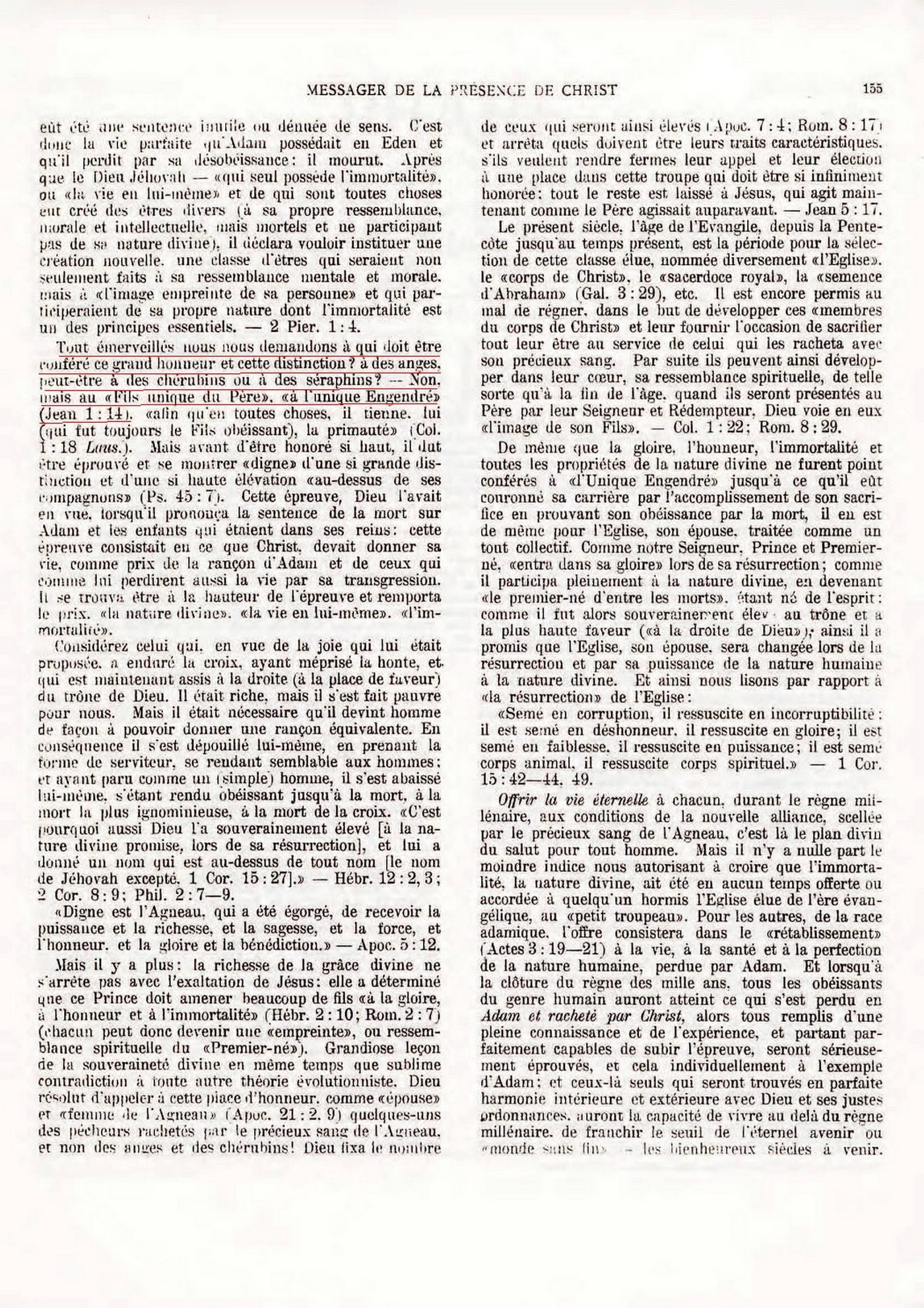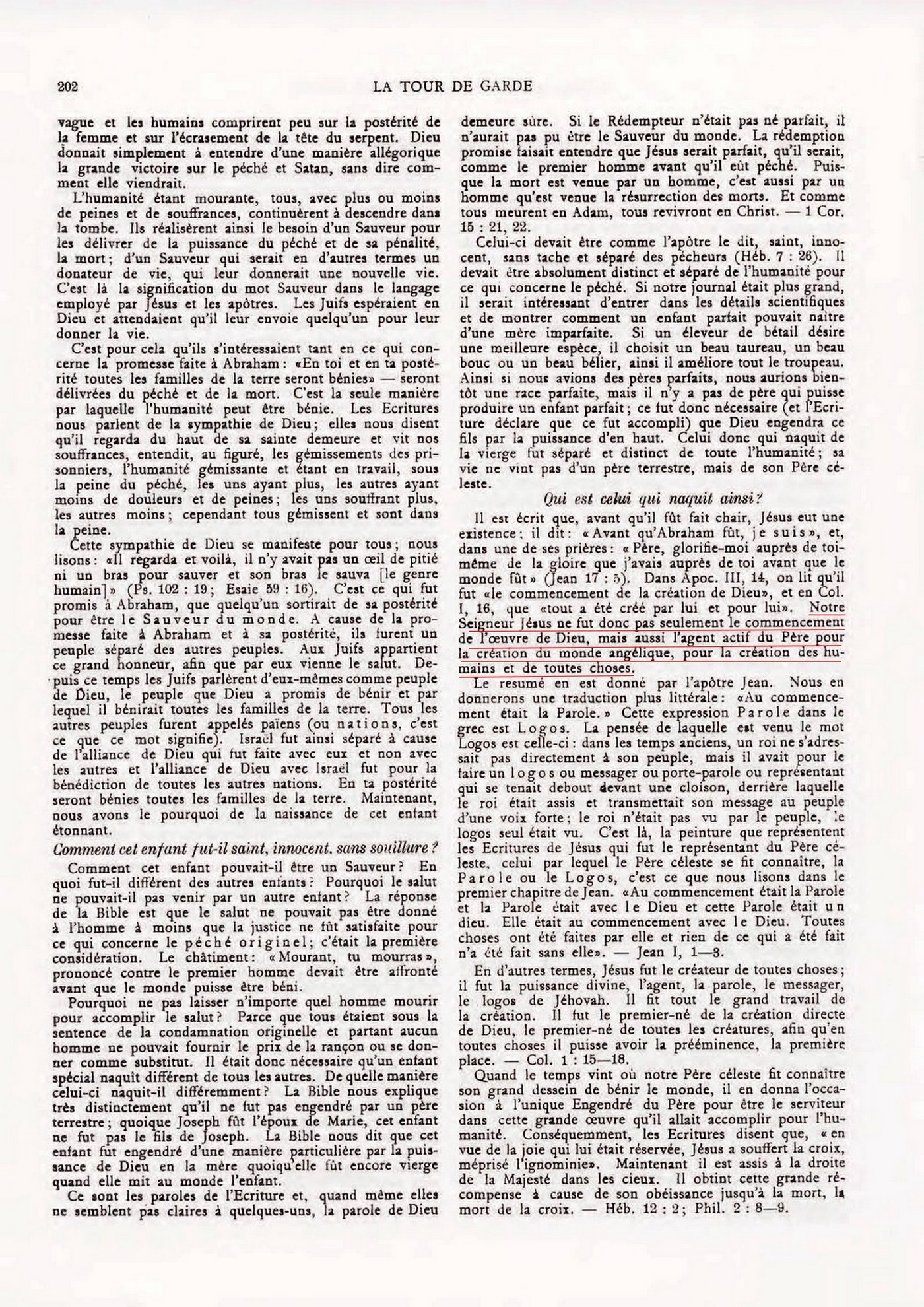 C'est pourquoi, dès le commencement, Dieu voulut que son Fils unique, le Premier-né de toute la création devînt le Rédempteur de l'homme, et dans ce but il dut devenir homme. La mort d'un ange n'aurait pu racheter l'homme... Les Ecritures nous apprennent que le Logos vint dans le monde volontairement... Le Père montra à son Fils que, s'il souffrait l'ignominie de descendre de la nature céleste la plus élevée à la nature humaine inférieure pour accomplir la rédemption de la race perdue d'Adam, il serait souverainement élevé auprès de Jéhovah; en participant à sa propre nature, la nature divine.