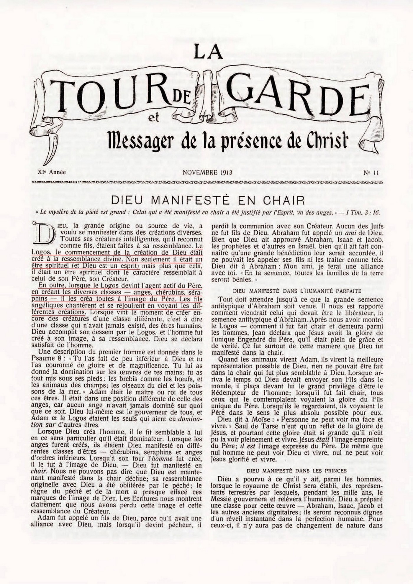notre Seigneur était le "commencement de la création du Dieu [Jéhovah]", et que le pouvoir divin était exercé par lui dans la création des différents ordres d'anges, car: "Toutes choses ont été faites par lui [le Logos], et rien de ce qui a été fait n'a été fait sans lui" (Apoc. 3:14; Jean 1:3, 10).