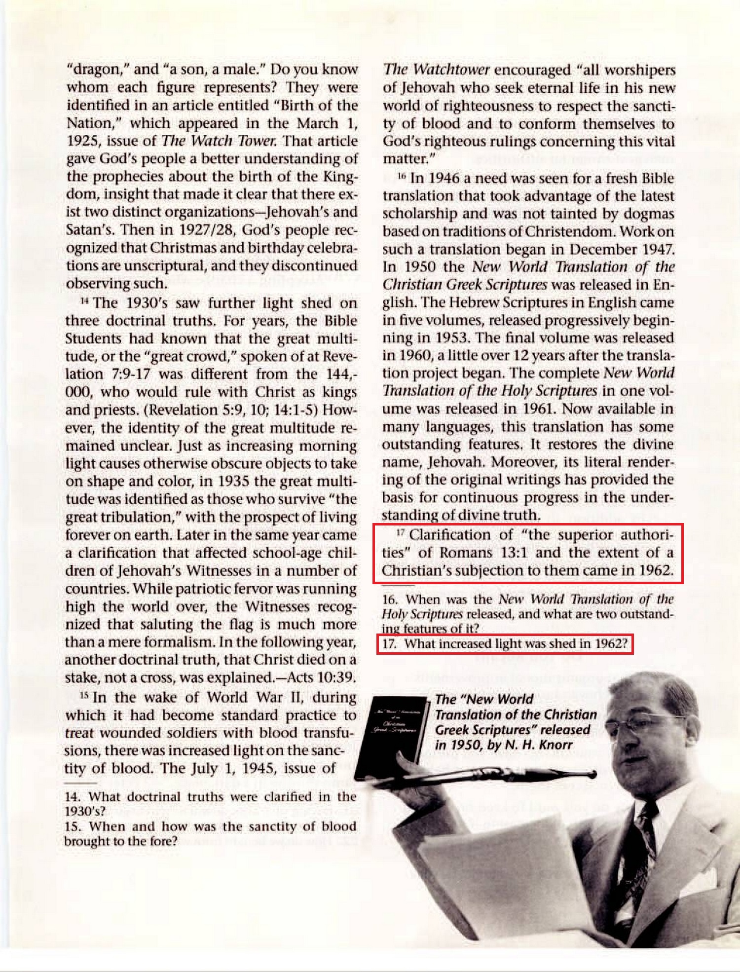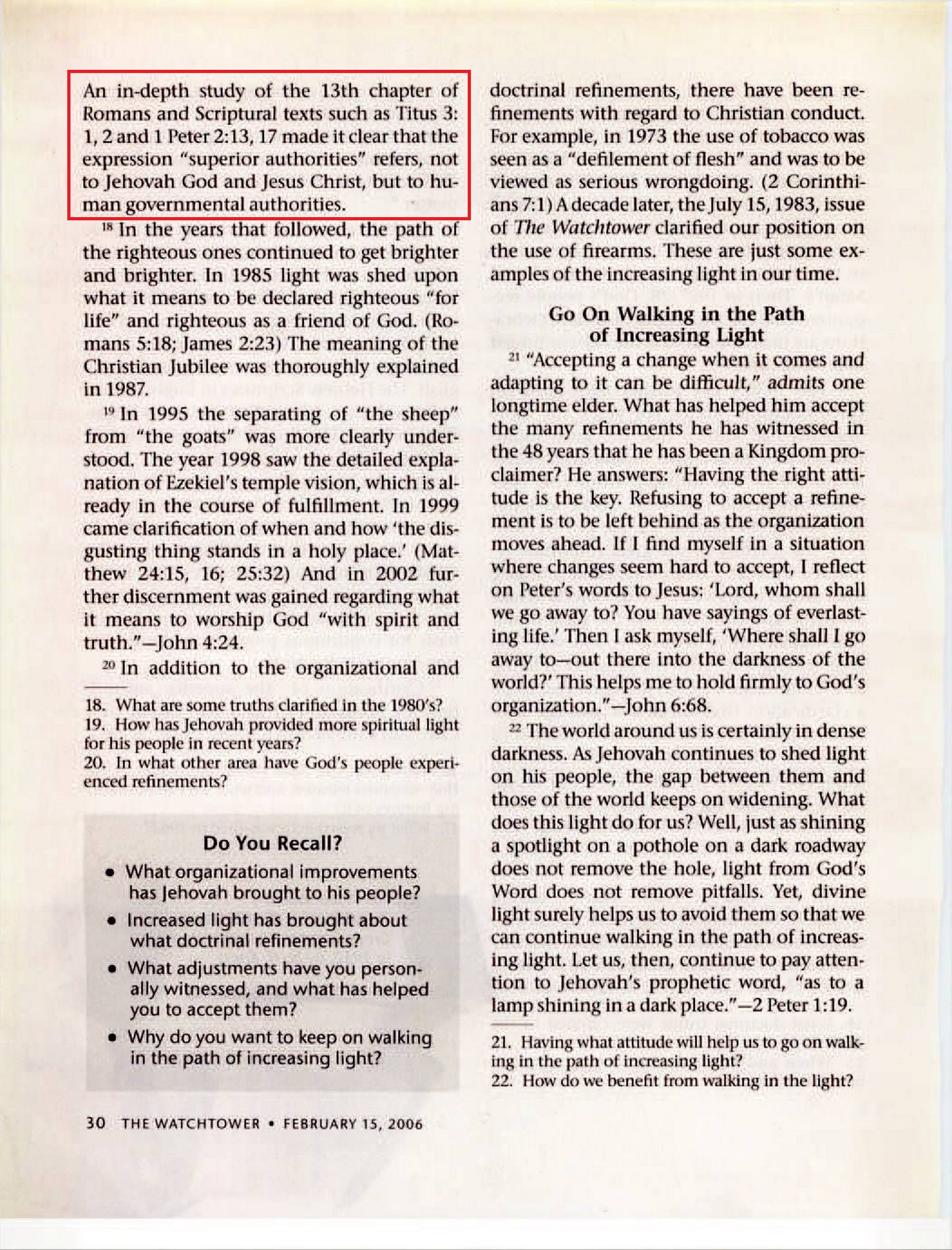 17. What increased light was shed in 1962? 17 Clarification of “the superior authorities” of Romans 13:1 and the extent of a Christian’s subjection to them came in 1962. An in-depth study of the 13th chapter of Romans and Scriptural texts such as Titus 3:1, 2 and 1 Peter 2:13, 17 made it clear that the expression “superior authorities” refers, not to Jehovah God and Jesus Christ, but to human governmental authorities. Source : 🇺🇸 1930 - The Watchtower, February 15, 2006, page 29, page 30 + Cover |