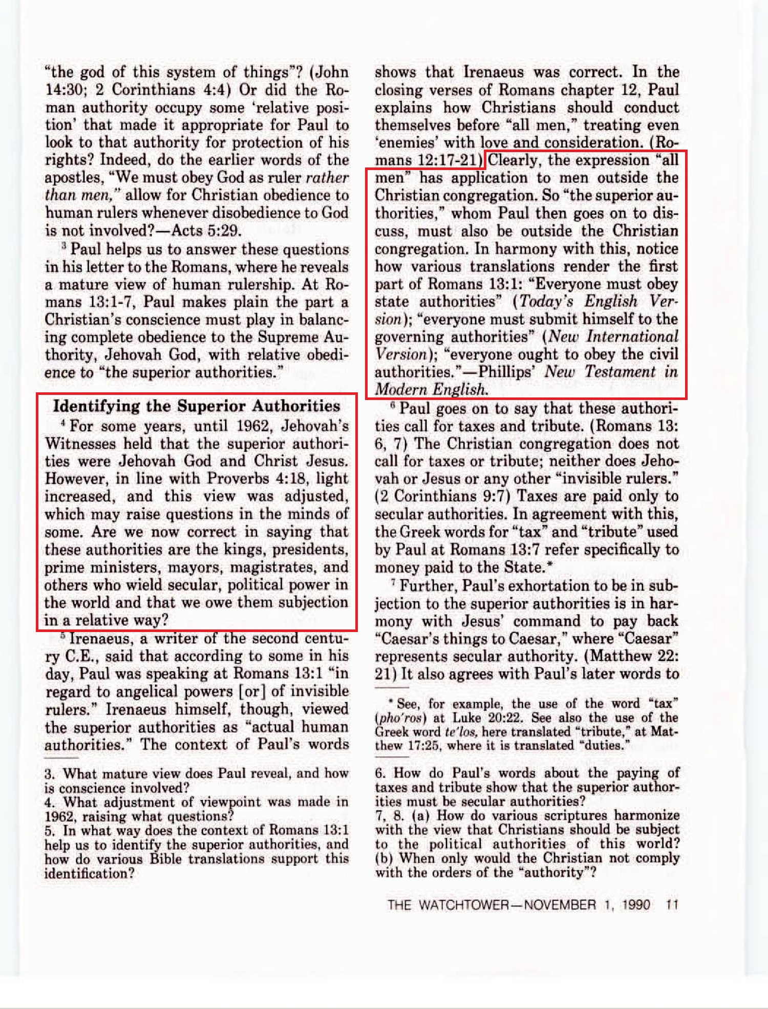 For some years, until 1962, Jehovah’s Witnesses held that the superior authorities were Jehovah God and Christ Jesus. However, in line with Proverbs 4:18, light increased, and this view was adjusted, which may raise questions in the minds of some. Are we now correct in saying that these authorities are the kings, presidents, prime ministers, mayors, magistrates, and others who wield secular, political power in the world and that we owe them subjection in a relative way? [...] Clearly, the expression “all men” has application to men outside the Christian congregation. So “the superior authorities,” whom Paul then goes on to discuss, must also be outside the Christian congregation. In harmony with this, notice how various translations render the first part of Romans 13:1: “Everyone must obey state authorities” (Today's English Version); “everyone must submit himself to the governing authorities” (New International Version); “everyone ought to obey the civil authorities.” — Phillips' New Testament in Modern English. Source : 🇺🇸 1930 - The Watchtower, November 1, 1990, page 11 + Cover |
