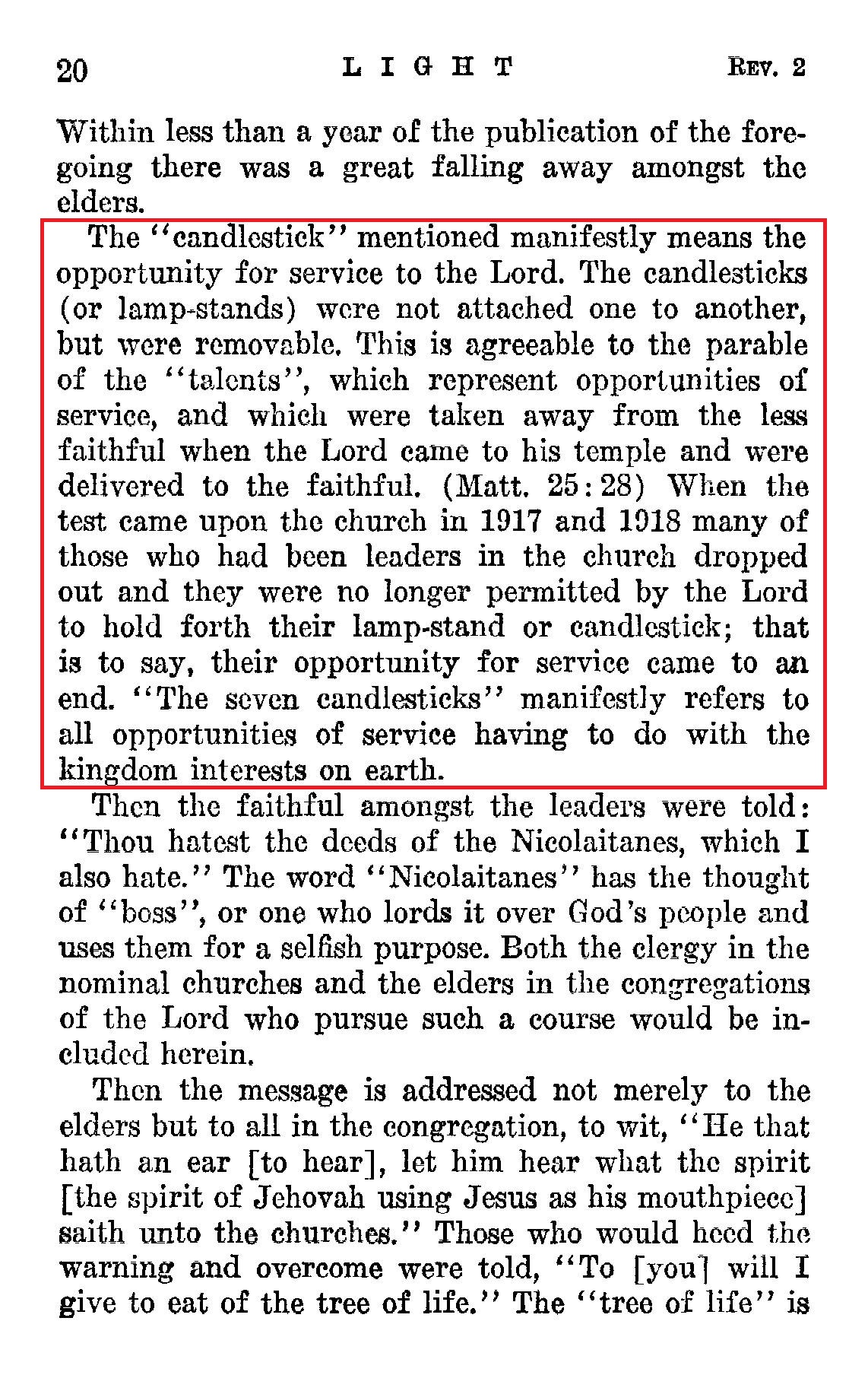 The "candlestick" mentioned manifestly means the opportunity for service to the Lord. The candlesticks (or lamp-stands) were not attached one to another, but were removable. This is agreeable to the parable of the "talents", which represent opportunities of service, and which were taken away from the less faithful when the Lord came to his temple and were delivered to the faithful. (Matt. 25: 28) When the test came upon the church in 1917 and ID1S many of those who had been leaders in the church dropped out and they were no longer permitted by the Lord to hold forth their lamp-stand or candlestick; that is to say, their opportunity for service came to an end. "The seven candlesticks" manifestly refers to all opportunities of service having to do with the kingdom interests on earth.