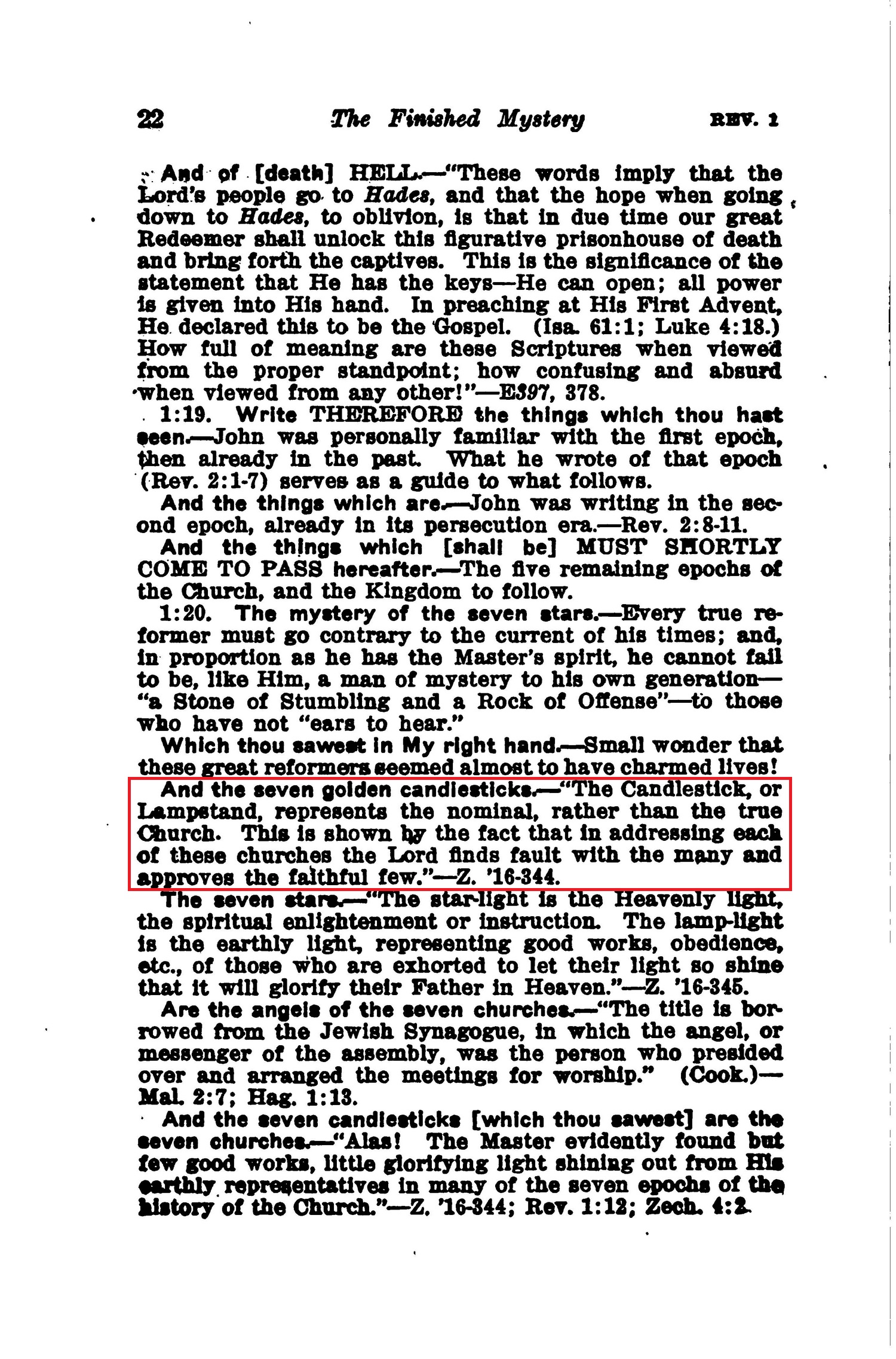 And the seven golden candlesticks.—"The Candlestick, or Lampstand, represents the nominal, rather than the true Church. This is shown hy the fact that in addressing each of these churches the Lord finds fault with the many and approves the faithful few." —Z.'16-344. Source : 🇺🇸 1917-1923 - Studies in the Scriptures, Vol 7, The finished mystery, page 22 + Cover |