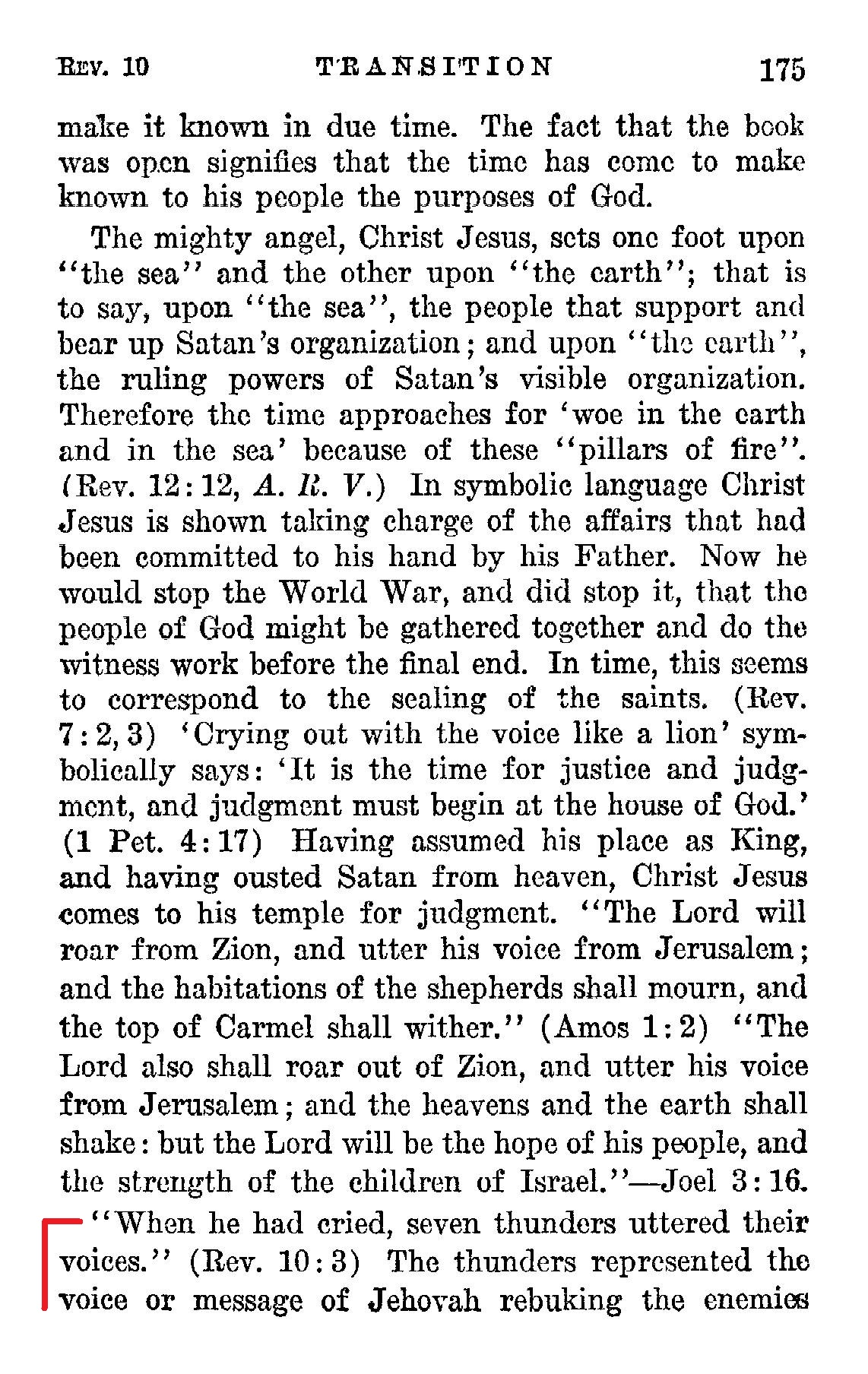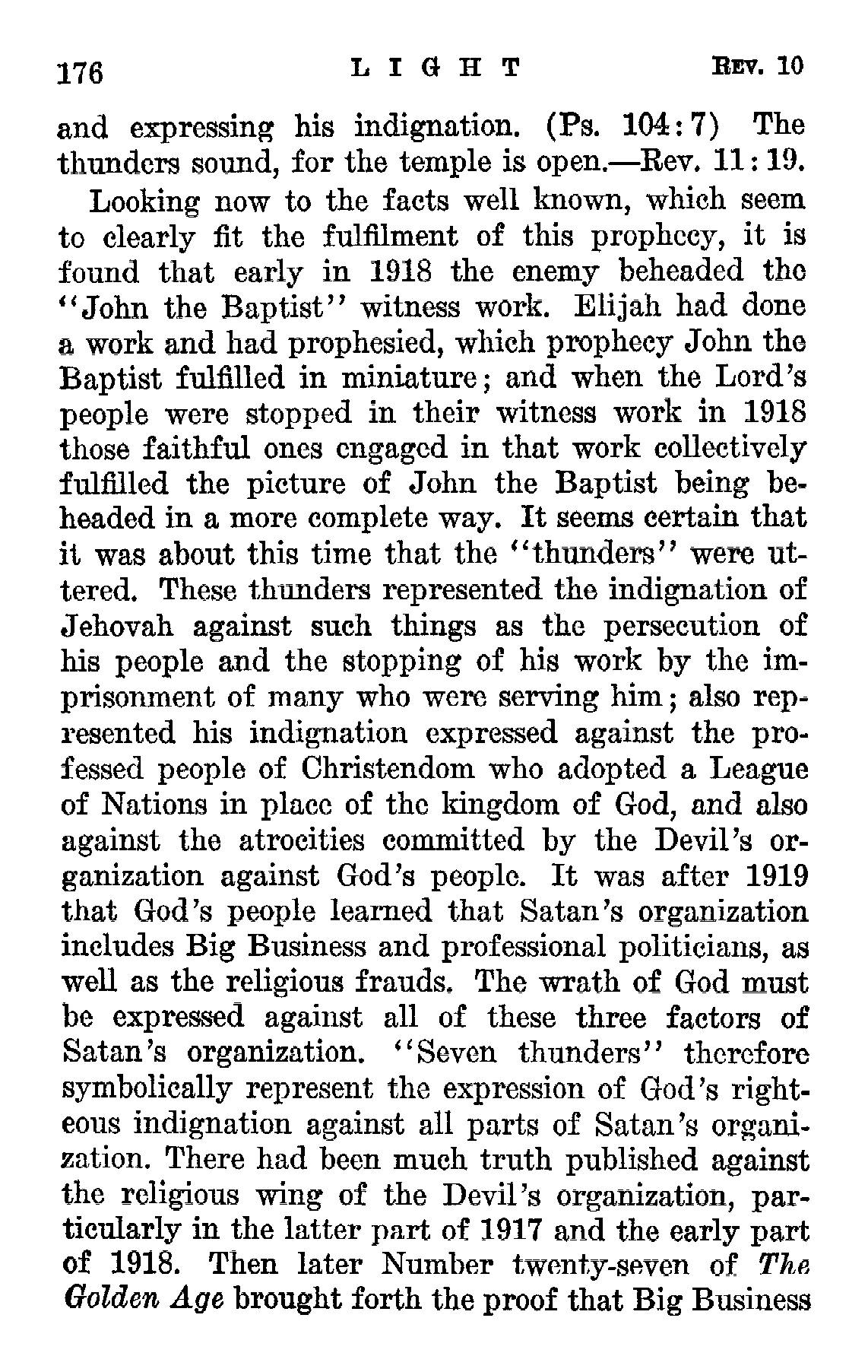 [...] it is found that early in 1918 the enemy beheaded the "John the Baptist" witness work [...] and when the Lord's people were stopped in their witness work in 1918 those faithful ones engaged in that work collectively fulfilled the picture of John the Baptist being beheaded in a more complete way. It seems certain that it was about this time that the "thunders" were uttered. These thunders represented the indignation of Jehovah against such things as the persecution of his people and the stopping of his work by the imprisonment of many who were serving him; also represented his indignation expressed against the professed people of Christendom who adopted a League of Nations in place of the kingdom of God... Source : 🇺🇸 1930 - Light, Vol 1, page 175, page 176 + Cover |