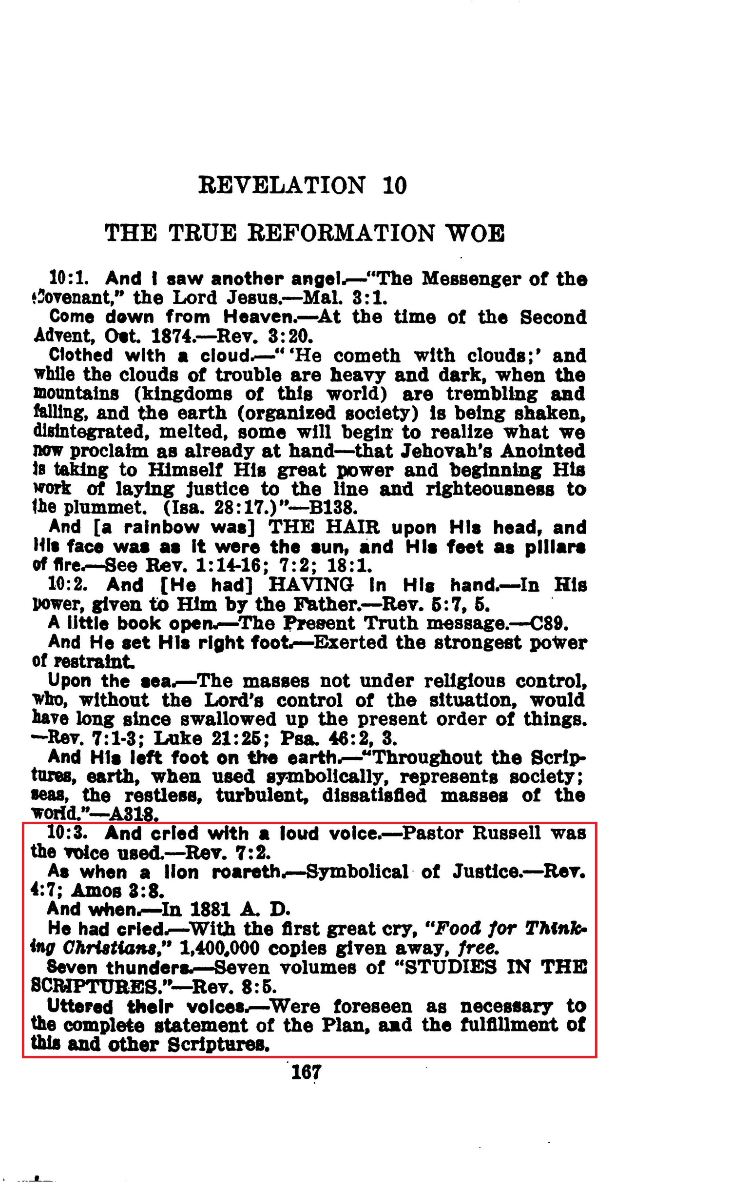 10:3. And cried with a loud voice. — Pastor Russell was the voice used.—Rev. 7:2. [...] And when. — In 1881 A. D. He had cried — With the first great cry, "Food for Thinking Christiana," 1,400,000 copies given away, free. Seven thunder — Seven volumes of "STUDIES IN THE SCRIPTURES." — Rev. 8:5. Uttered their voices. — Were foreseen as necessary to the complete statement of the Plan, and the fulfillment of this and other Scriptures. — Source : 🇺🇸 1917 - Studies in the Scriptures, Vol 7, The finished mystery, page 167 + Cover |