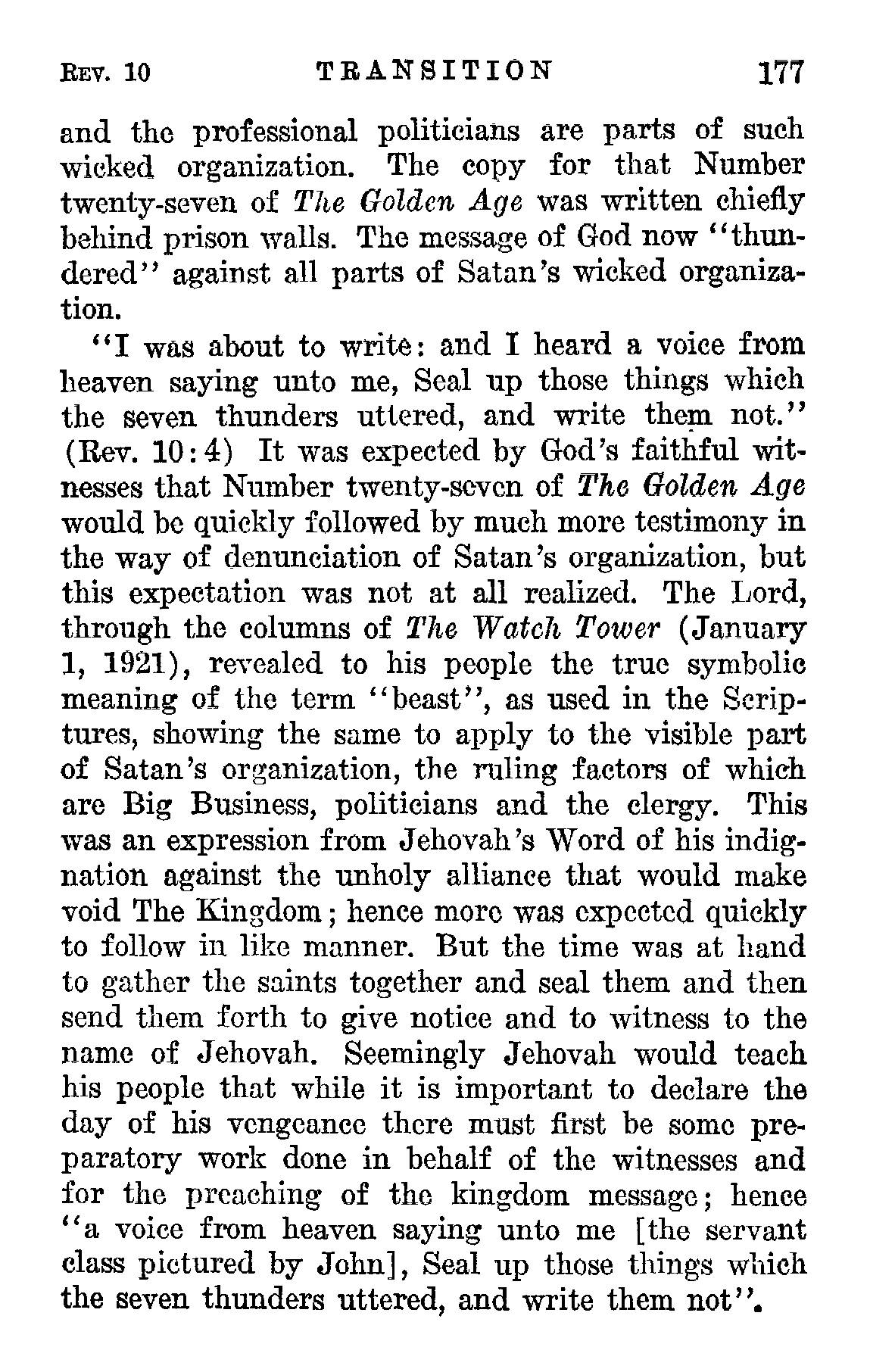this expectation was not at all realized. The Lord, through the columns of The Watch Tower (January 1, 1921), revealed to his people the true symbolic meaning of the term "beast", as used in the Scriptures, showing the same to apply to the visible part of Satan's organization, the ruling factors of which are Big Business, politicians and the clergy. This was an expression from Jehovah's Word of his indignation against the unholy alliance that would make void The Kingdom; hence more was expected quickly to follow in like manner. But the time was at hand to gather the saints together and seal them and then send them forth to give notice and to witness to the name of Jehovah. Seemingly Jehovah would teach his people that while it is important to declare the day of his vengeance there must first be some preparatory work done in behalf of the witnesses and for the preaching of the kingdom message; hence "a voice from heaven saying unto me [the servant class pictured by John], Seal up those things which the seven thunders uttered, and write them not".