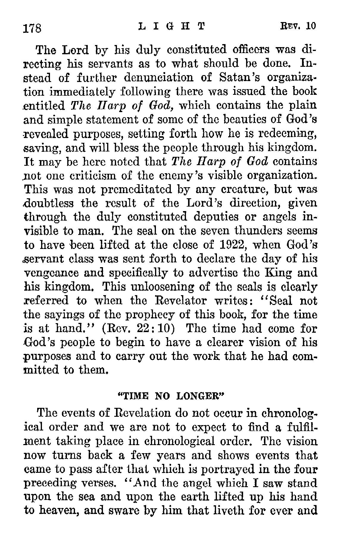 The Lord by his duly constituted officers was directing his servants as to what should be done. Instead of further denunciation of Satan's organization immediately following there was issued the book entitled The Harp of God, which contains the plain and simple statement of some of the beauties of God's revealed purposes, setting forth how he is redeeming, saving, and will bless the people through his kingdom. It may be here noted that The Harp of God contains not one criticism of the enemy's visible organization. This was not premeditated by any creature, but was doubtless the result of the Lord's direction, given through the duly constituted deputies or angels invisible to man. Source : 🇺🇸 1930 - Light, Vol 1, page 177, page 178 + Cover |