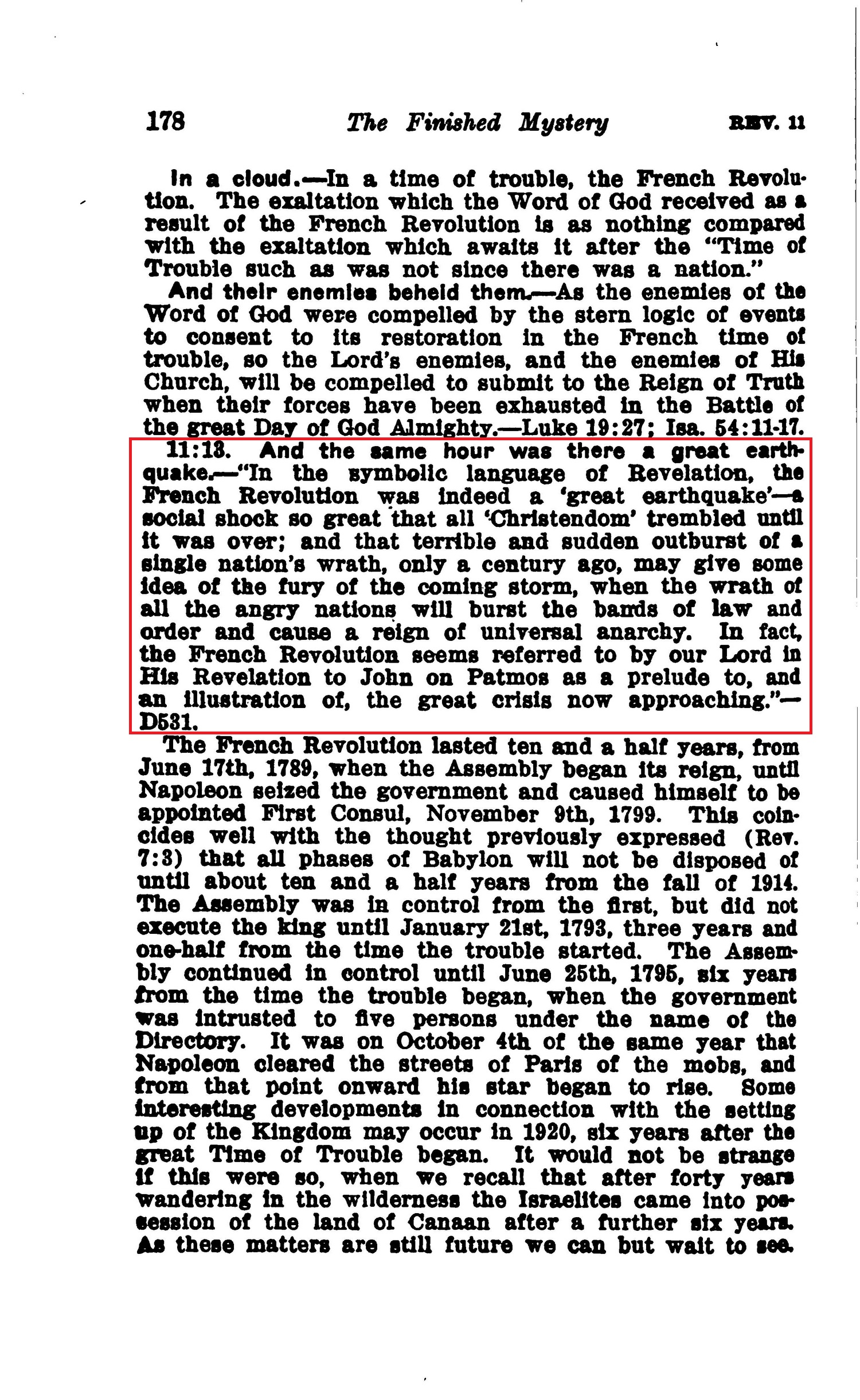 11:13. And the tame hour was there a great earthquake. — "In the symbolic language of Revelation, the French Revolution was indeed a 'great earthquake' — a social shock so great that all 'Christendom' trembled until It was over; and that terrible and sudden outburst of a single nation's wrath, only a century ago, may give some Idea of the fury of the coming storm, when the wrath of all the angry nations will burst the bands of law and order and cause a reign of universal anarchy. In fact, the French Revolution seems referred to by our Lord in His Revelation to John on Patmos as a prelude to, and an illustration of, the great crisis now approaching."— D531. Source : 🇺🇸 1917 - Studies in the Scriptures, Vol 7, The finished mystery, page 178 + Cover |