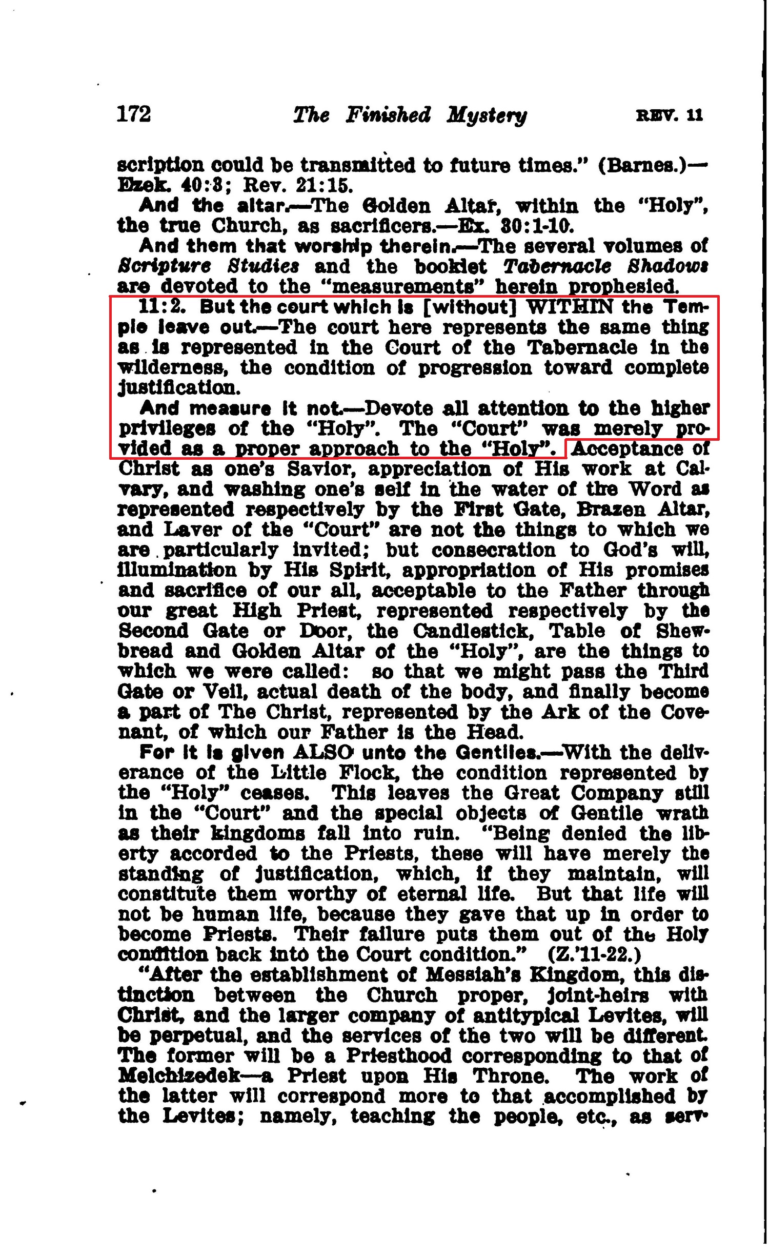 11:2. But the court which is [without] WITHIN the Temple leave out. — The court here represents the same thing as la represented In the Court of the Tabernacle in the wilderness, the condition of progression toward complete Justification. And measure It not. — Devote all attention to the higher privileges of the "Holy". The "Court" was merely provided as a proper approach to the "Holy". Source : 🇺🇸 1917 - Studies in the Scriptures, Vol 7, The finished mystery, page 172 + Cover |