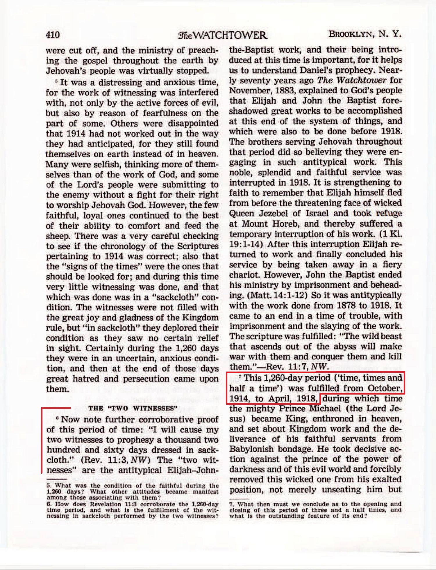 Now note further corroborative proof of this period of time: “I will cause my two witnesses to prophesy a thousand two hundred and sixty days dressed in sackcloth.” (Rev. 11:3, NW) [...] This 1,260-day period ('time, times and half a time') was fulfilled from October, 1914, to April, 1918, [...]