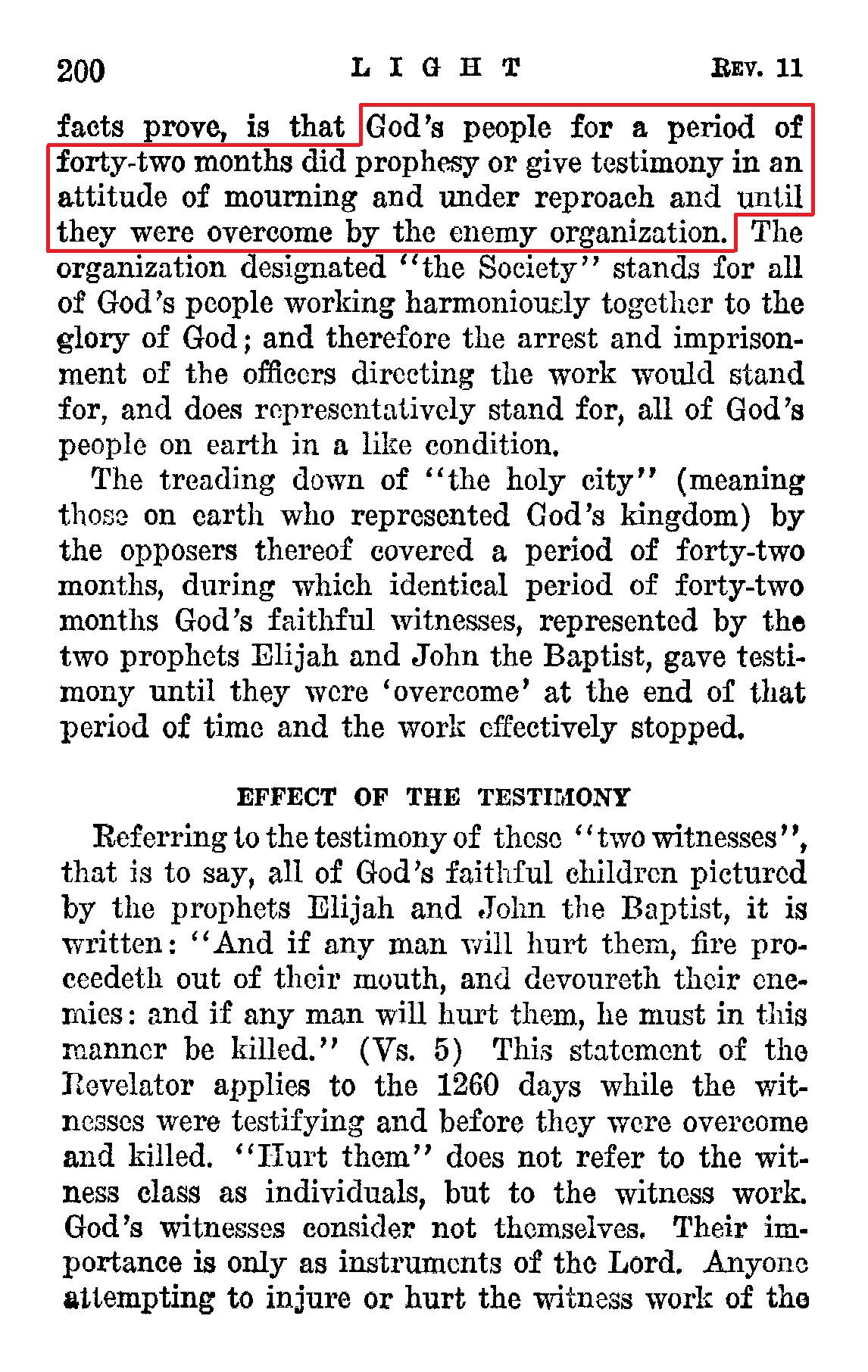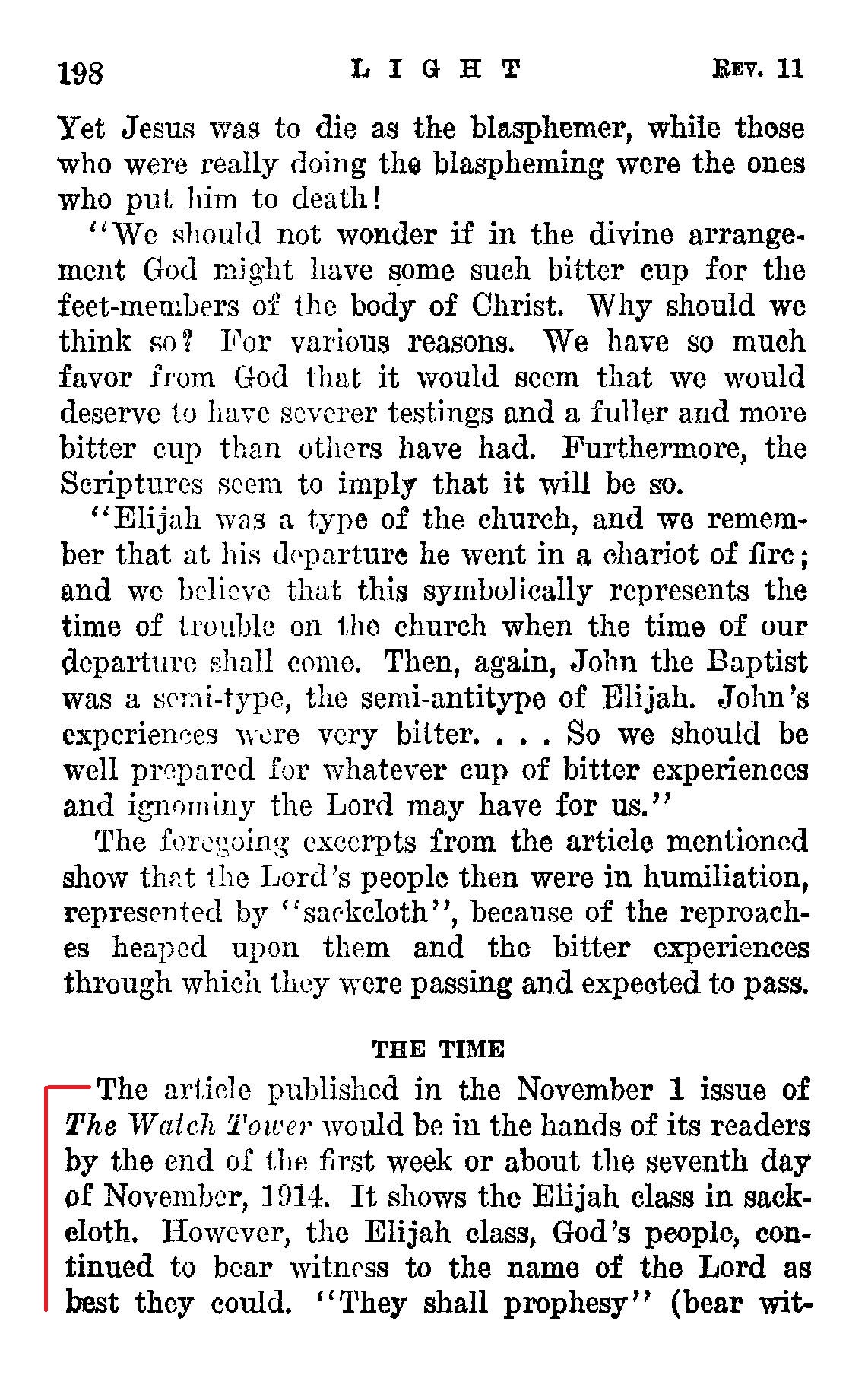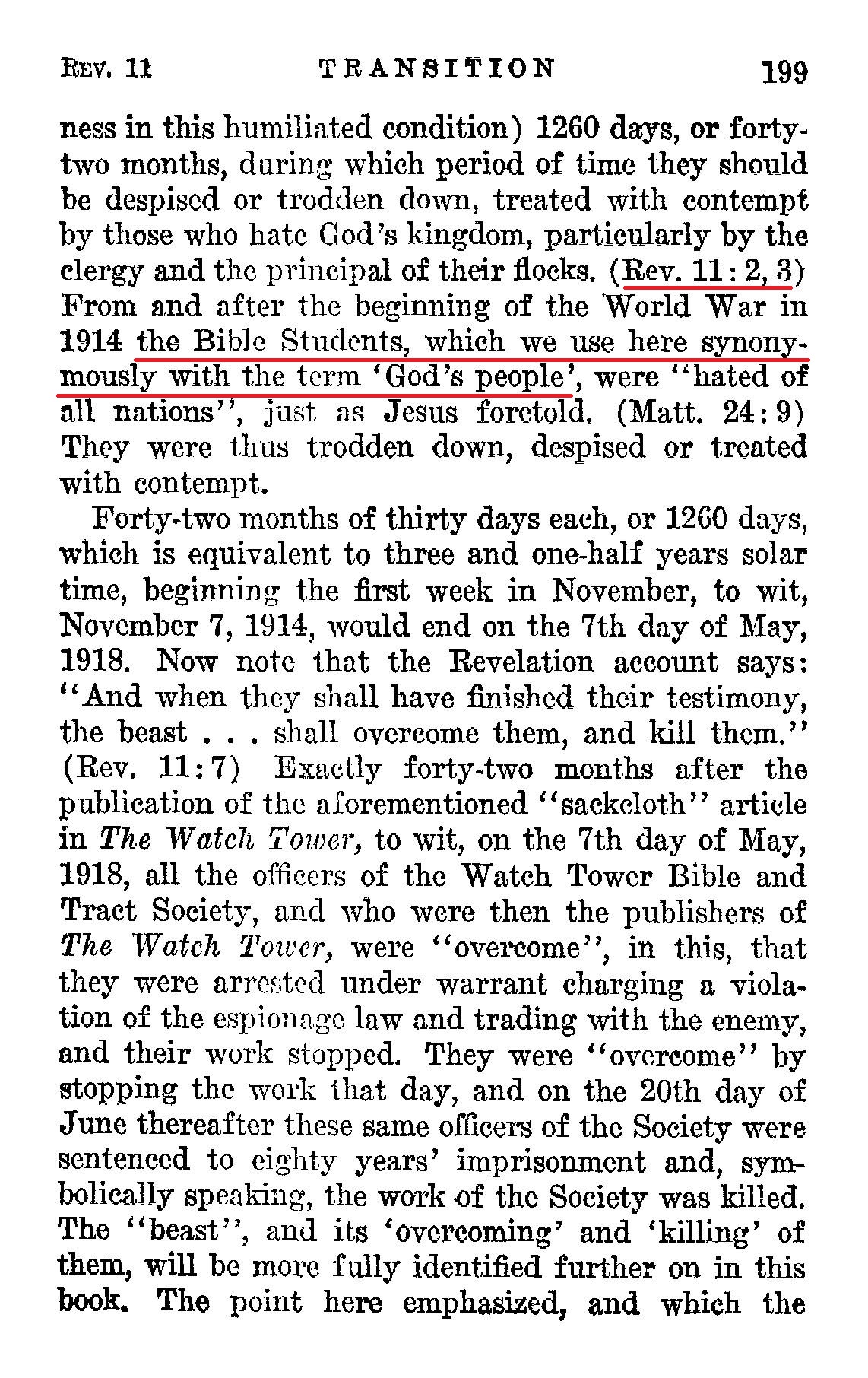 THE TIME The article published in the November 1 issue of The Watch Tower would be in the hands of its readers by the end of the first week or about the seventh day of November, 1914. It shows the Elijah class in sack. [...] "They shall prophesy" (bear witness in this humiliated condition) 1260 days, or forty two months, [...] (Rev. 11:2, 3) From and after the beginning of the World War in 1914 the Bible Students, which we use here synonymously with the term 'God's people', were "hated of fill nations", just as Jesus foretold. (Matt. 24:9) They were thus trodden down, despised or treated with contempt. Forty-two months of thirty days each, or 1260 days, which is equivalent to three and one-half years solar time, beginning the first week in November, to wit, November 7, 1914, would end on the 7th day of May, 1918. [...] The point here emphasized, and which the facts prove, is that God's people for a period of forty-two months did prophesy or give testimony in an attitude of mourning and under reproach and until they were overcome by the enemy organization. Source : 🇺🇸 1930 - Light, Vol 1, page 198, page 199, page 200 + Cover |