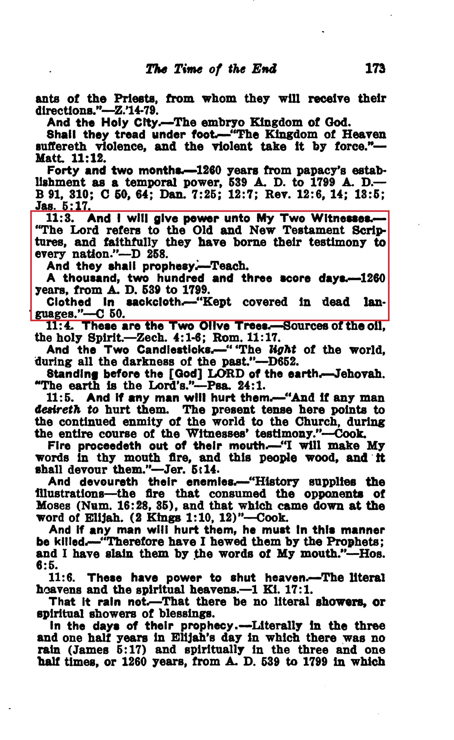 11:3. And I will give power unto My Two Witnesses. — "The Lord refers to the Old and New Testament Scriptures, and faithfully they have borne their testimony to every nation."— D 258. And they shall prophesy. — Teach. A thousand, two hundred and three score days. — 1260 years, from A. D. 639 to 1799. Clothed In sackcloth. — "Kept covered in dead languages." — C 50. Source : 🇺🇸 1917 - Studies in the Scriptures, Vol 7, The finished mystery, page 173 + Cover |