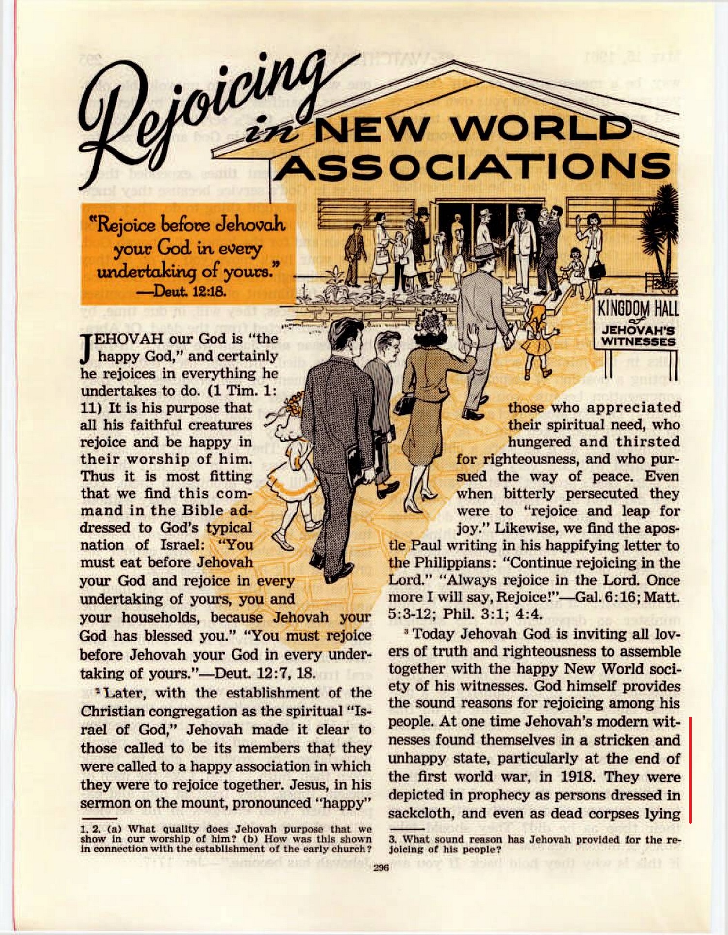 At one time Jehovah’s modern witnesses found themselves in a stricken and unhappy state, particularly at the end of the first world war, in 1918. They were depicted in prophecy as persons dressed in sackcloth, and even as dead corpses lying in the streets. (Rev. 11:3, 7-10) But Jehovah caused the condition of his people to be changed from that of sorrow and mourning to one of joy and happiness. He delivered his faithful witnesses from their deathlike state of inactivity, put his spirit upon them [...]