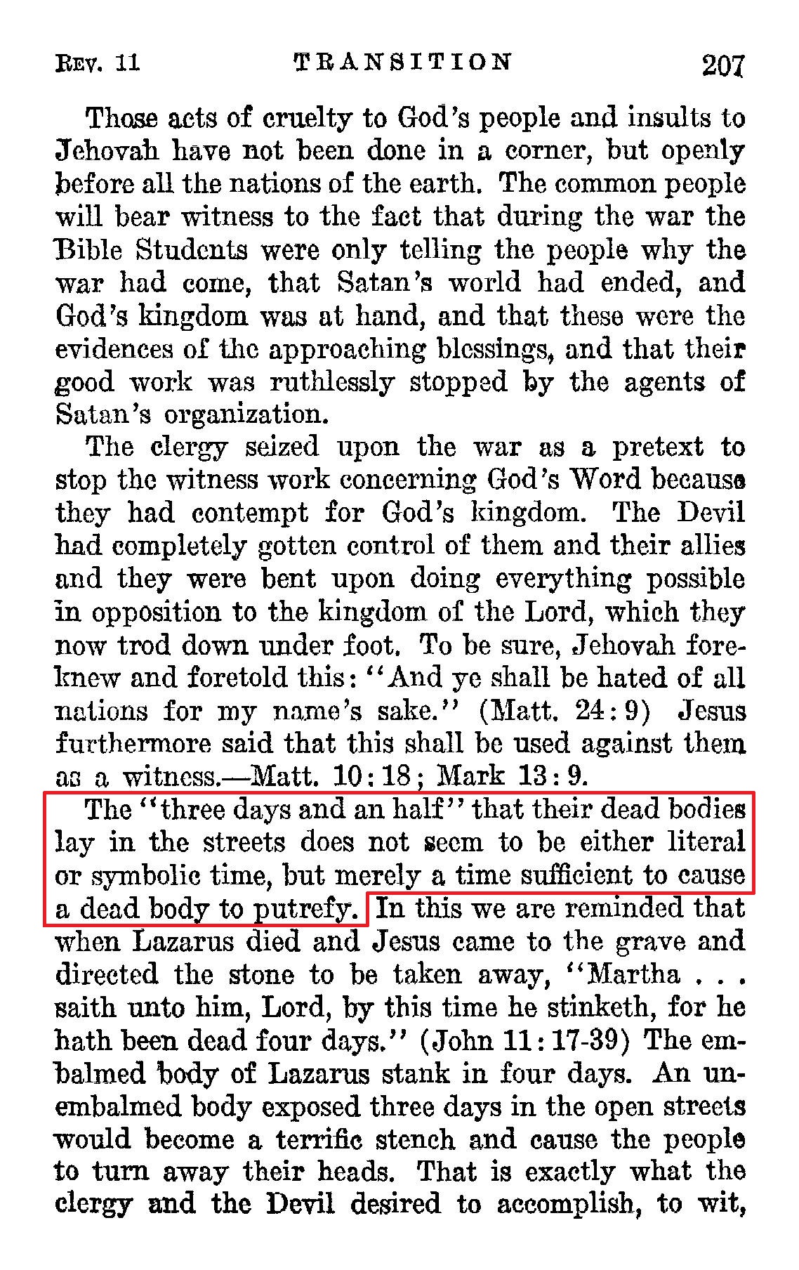 The "three days and an half" that their dead bodies lay in the streets does not seem to be either literal or symbolic time, but merely a time sufficient to cause a dead body to putrefy. [...] Therefore it is written: "And after three days and an half the spirit of life from God entered into them, and they stood upon their feet." (Vs, 11) Manifestly this refers to another short period of time sufficient to let the clergy and their allies put the Bible Students out of their minds. Source : 🇺🇸 1930 - Light, Vol 1, page 207, page 210 + Cover |