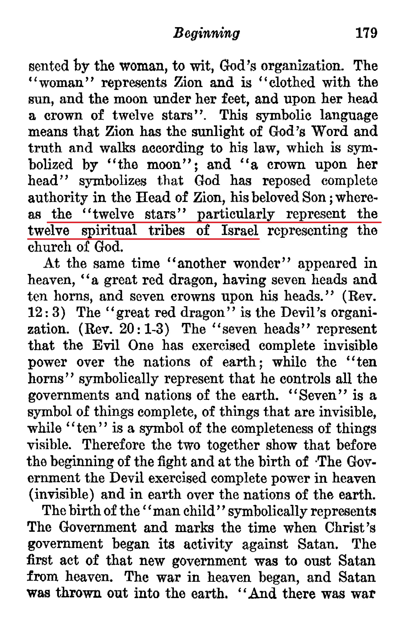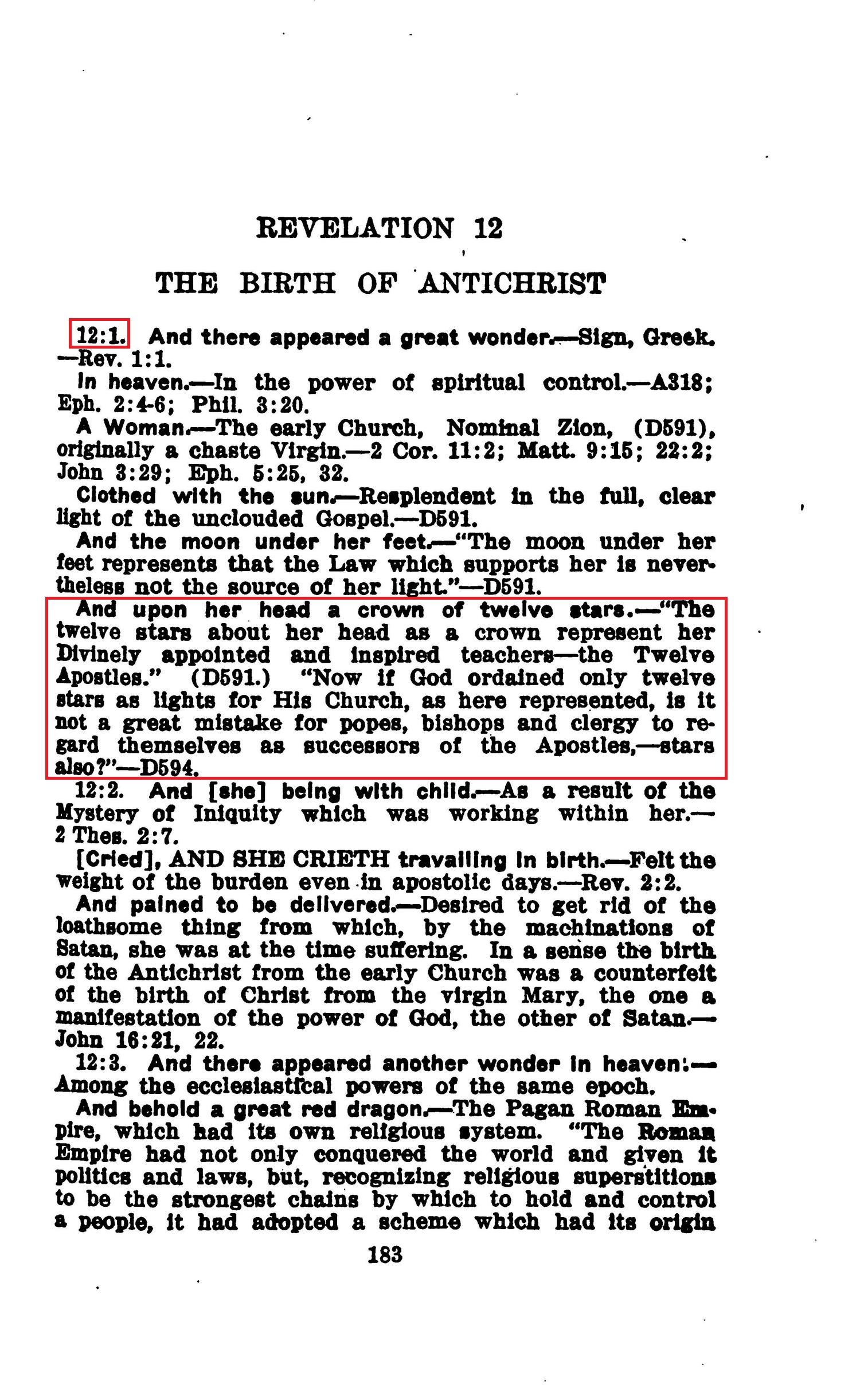 And upon her head a crown of twelve stars. — "The twelve stars about her head as a crown represent her Divinely appointed and Inspired teachers — the Twelve Apostles" (D591.) "Now if God ordained only twelve stars as lights for His Church, as here represented, is it not a great mistake for popes, bishops and clergy to regard themselves as successors of the Apostles, — stars also?"— D594. Source : 🇺🇸 1917 - Studies in the Scriptures, Vol 7, The finished mystery, page 183 + Cover |