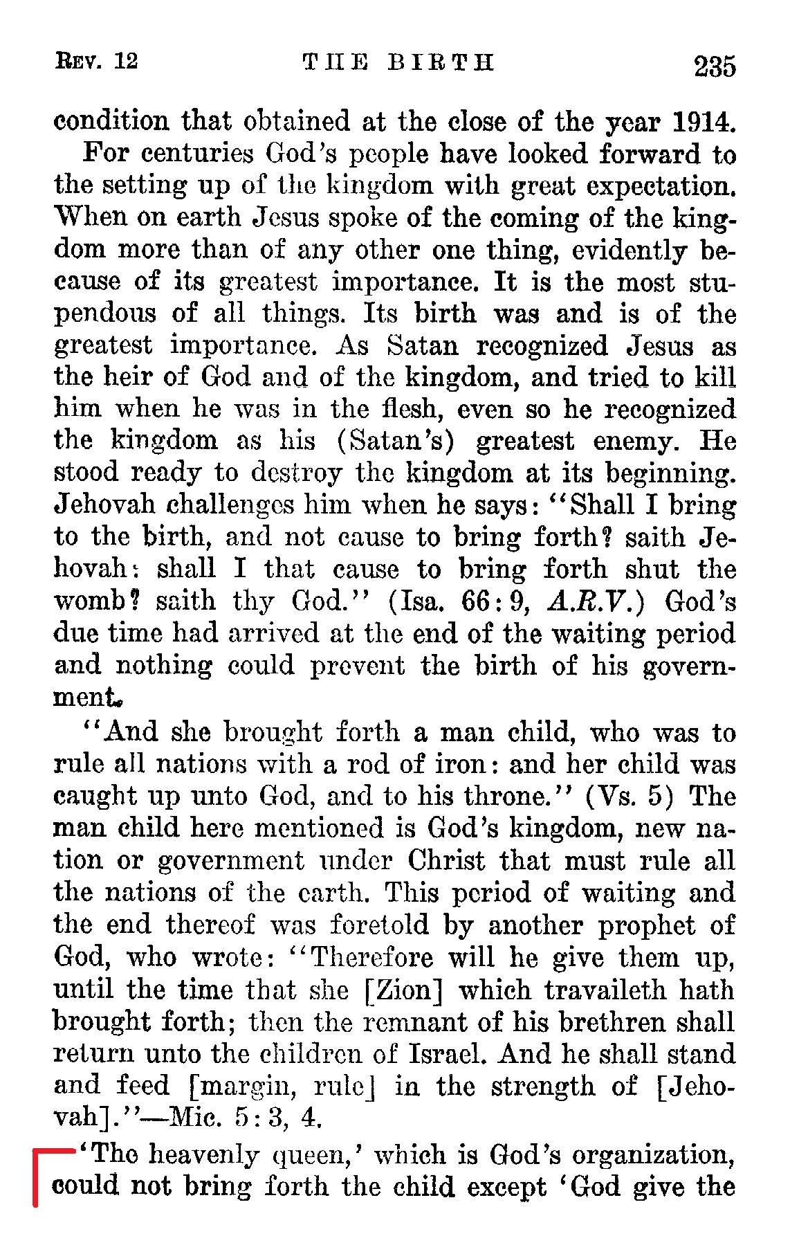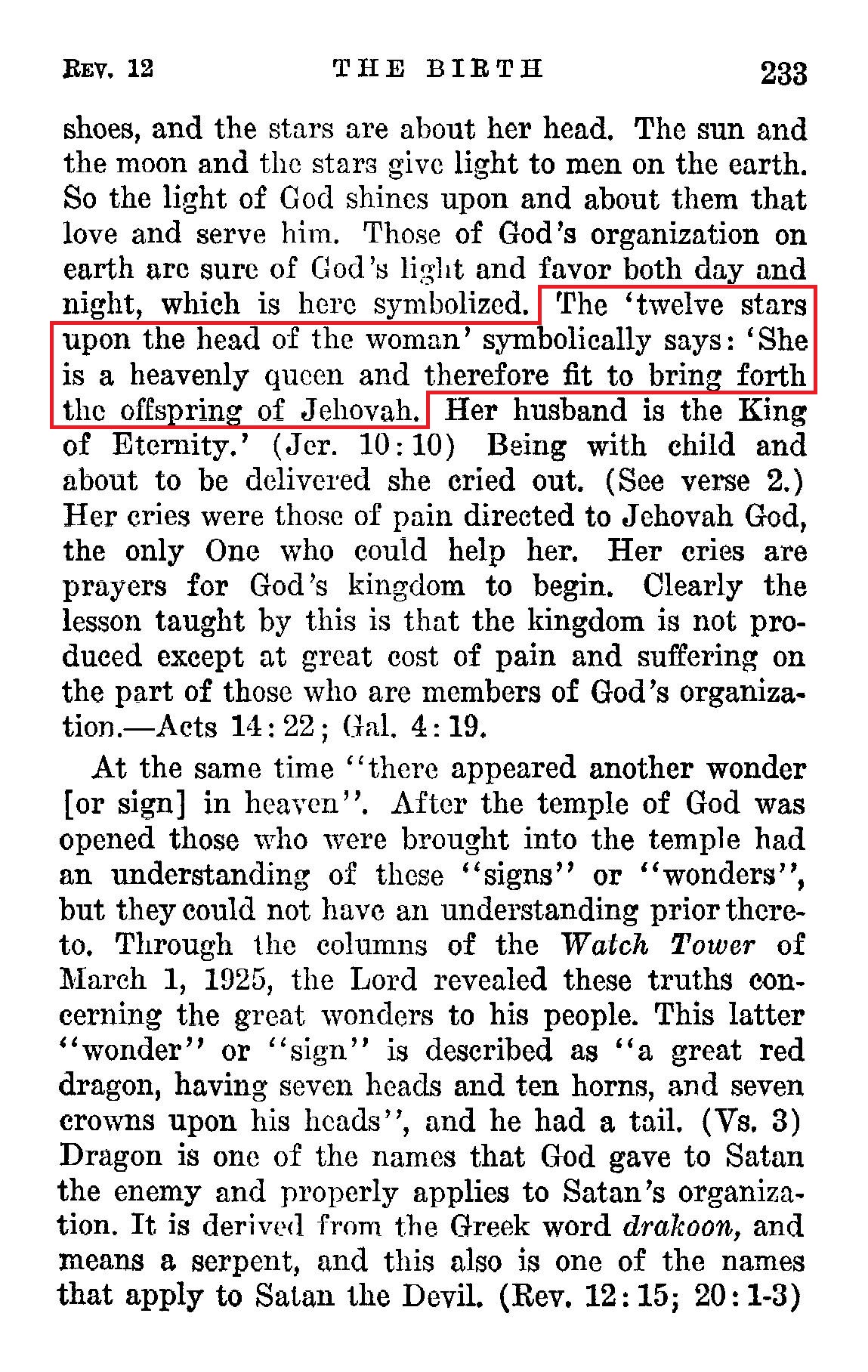 The 'twelve stars upon the head of the woman' symbolically says: 'She is a heavenly queen and therefore fit to bring forth the offspring of Jehovah. Her husband is the King of Eternity.' (Jer. 10:10) Being with child and about to be delivered she cried out. (See verse 2.) Her cries were those of pain directed to Jehovah God, the only One who could help her. Her cries are prayers for God's kingdom to begin. Clearly the lesson taught by this is that the kingdom is not produced except at great cost of pain and suffering on the part of those who are members of God's organization. Source : 🇺🇸 1930 - Light, Vol 1, page 233 + Cover |