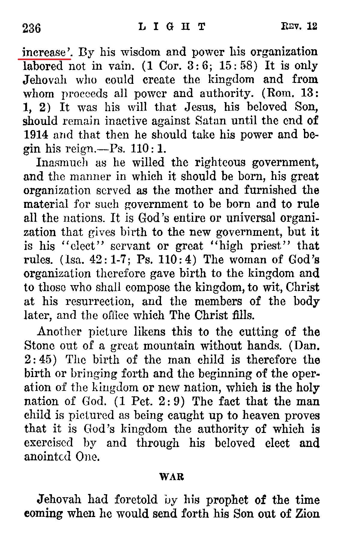 'The heavenly queen,' which is God's organization, could not bring forth the child except 'God give theincrease'. Source : 🇺🇸 1930 - Light, Vol 1, page 235, page 236 + Cover |