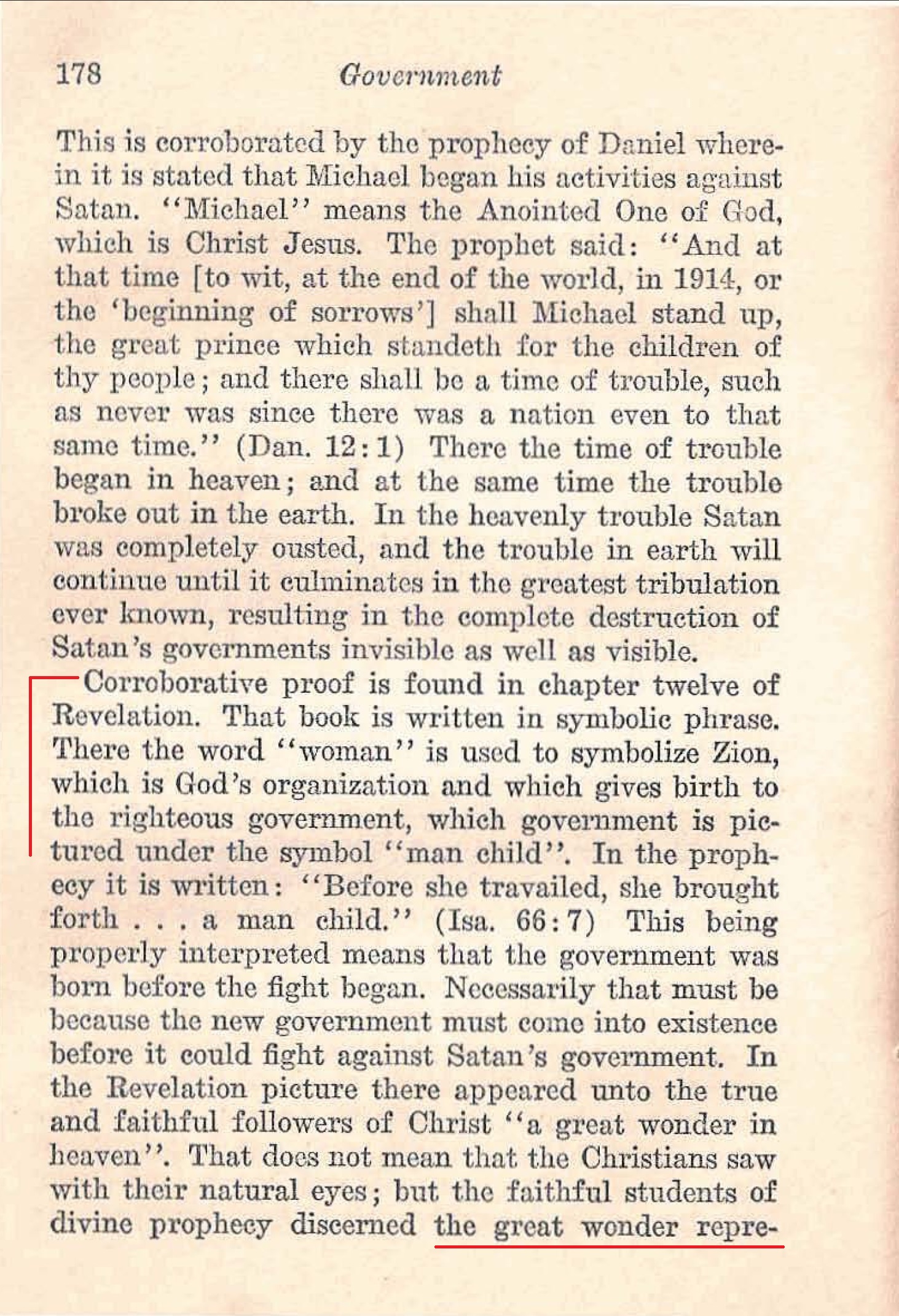 Corroborative proof is found in chapter twelve of Revelation. That book is written in symbolic phrase. There the word “woman” is used to symbolize Zion, which is God’s organization and which gives birth to the righteous government, which government is pictured under the symbol “man child”. [...] That does not mean that the Christians saw with their natural eyes ; but the faithful students of divine prophecy discerned the great wonder represented by the woman, to wit, God’s organization. The “woman” represents Zion and is “clothed with the sun, and the moon under her feet, and upon her head a crown of twelve stars”.
