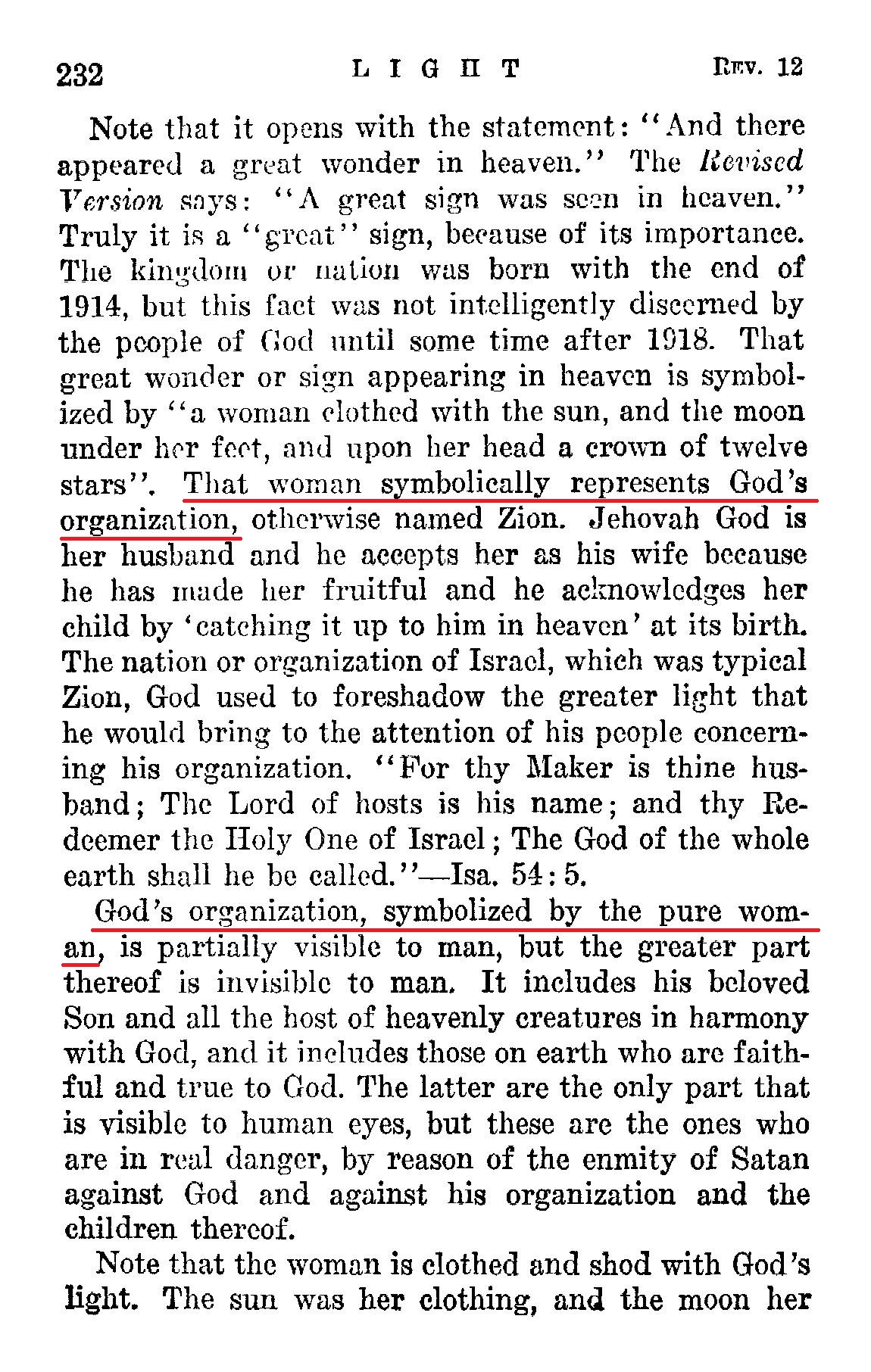 The twelfth chapter of Revelation should now be carefully read. Note that it opens with the statement: "And there appeared a great wonder in heaven." The Revised Version says: "A great sign was seen ill heaven." Truly it is a "great" sign, because of its importance. The kingdom or nation was born with the end of 1914, but this fact was not intelligently discerned by the people of Cod until some time after 1918. That great wonder or sign appearing in heaven is symbolized by "a woman clothed with the sun, and the moon under her fcot, ana upon her head a crown of twelve stars". That woman symbolically represents God's organization, otherwise named Zion. [...] God's organization, symbolized by the pure woman, is partially visible to man, but the greater part thereof is invisible to man. It includes his beloved Son and all the host of heavenly creatures in harmony with God, and it includes those on earth who are faithful and true to God. Source : 🇺🇸 1930 - Light, Vol 1, page 231, page 232 + Cover |
