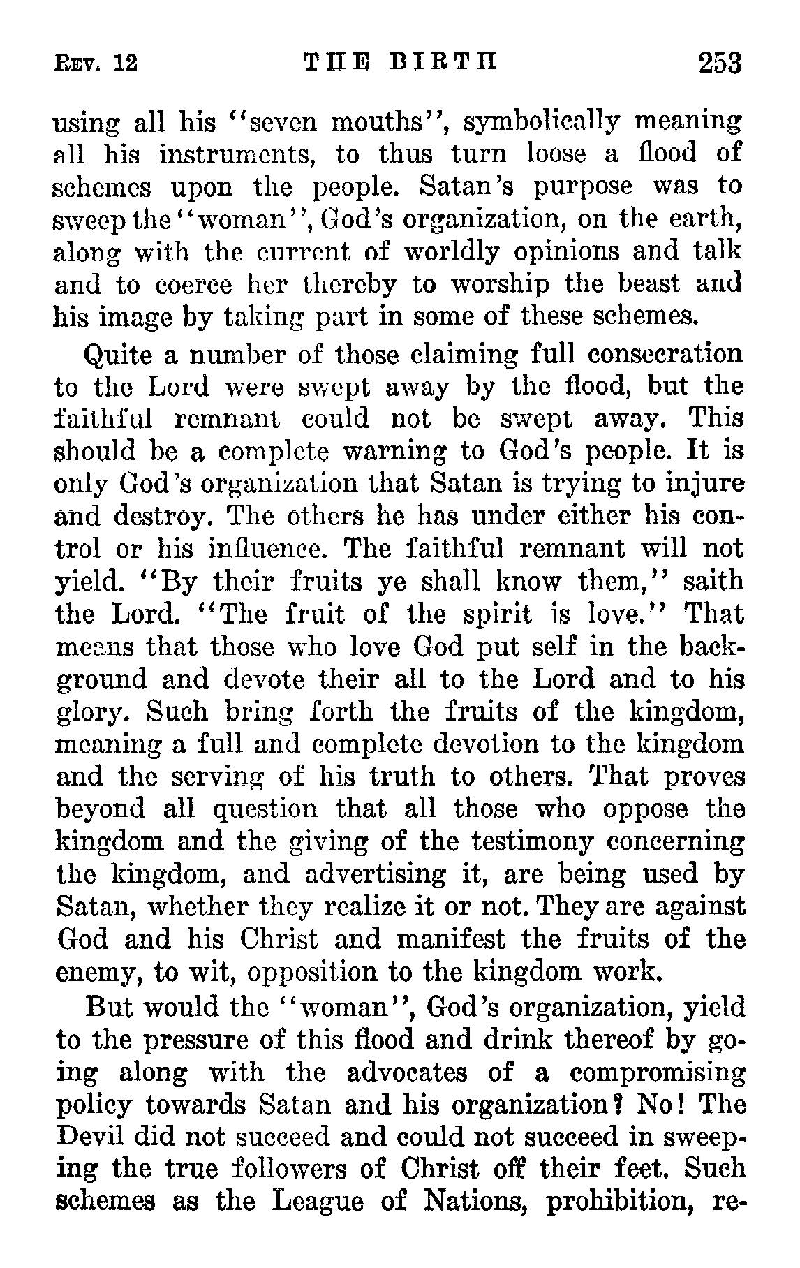 "And the serpent cast out of his mouth water as a flood, after the woman, that he might cause her to be carried away of the flood." (Rev. 12:15) The word flood is by some translators rendered river. (Diag.) This 'flood of water' coming out of the mouth of Satan symbolized doctrines talked about, schemes and various palaver intended to deceive. Satan used every available instrument to accomplish that purpose. In the fiery times of 1917 and 1918 a number who had pretended to be in the truth and followers of Christ broke away from God's organization and immediately began talking and publishing their own views in divers and numerous ways and taking special care that from that time forward those who remained faithful and held fast to God's organization received copies of these messages. Their publications that began about that time increased and continue. The purpose manifestly was and is to draw others away from the Society. Thus Satan used these as instruments. From the spring of 1919 and thereafter there flowed a great flood of talk and schemes such as peace treaties, conferences, parleys, and political propaganda and a cavorting by the clergy, all of which was directing the people away from God to Satan's schemes. The greater portion thereof came from Britain and America. Politicians, Big Business and the clergy joined together in the promulgation of these schemes. It may well be said that the Devil has been using all his "seven mouths", symbolically meaning all his instruments, to thus turn loose a flood of schemes upon the people. Satan's purpose was to sweep the "woman", God's organization, on the earth, along with the current of worldly opinions and talk and to coerce her thereby to worship the beast and his image by taking part in some of these schemes. Source : 🇺🇸 1930 - Light, Vol 2, page 252, page 253 + Cover |